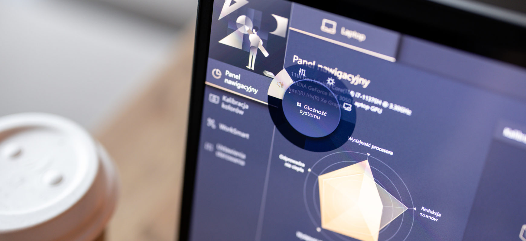Podobnie jak w StudioBooku 16 ASUS oddaje nam też do dyspozycji panel kontrolny ProArt Creator Hub, który działa na podobnej zasadzie jak gamingowe oprogramowanie Armory Crate, z którym większość użytkowników może być już zaznajomiona – to jedno miejsce, w którym możemy sterować wszystkimi parametrami komputera, podejrzeć aktualne obciążenie podzespołów, skalibrować wyświetlacz czy dostosować możliwości pokrętła ASUS DialPad.