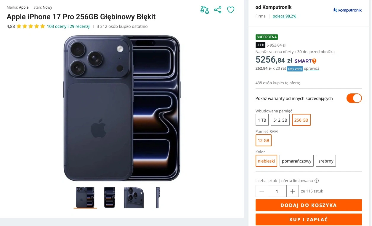 iPhone 17 Pro za 256 GB za 5256 zł (zamiast 5799 zł)