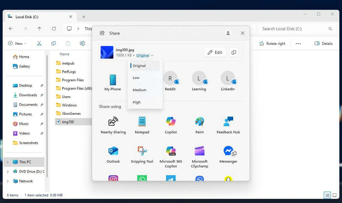 Mechanizm działania jest elegancko prosty: użytkownik wybiera plik graficzny, wywołuje menu Udostępnij prawym przyciskiem myszy lub z paska narzędzi, a następnie za pomocą listy rozwijanej wybiera jeden z czterech poziomów jakości: Original (oryginalną), High (wysoką), Medium (średnią) lub Low (niską). System automatycznie tworzy skompresowaną kopię z sufiksem _compressed, zachowując oryginalny plik w niezmienionej postaci. Kluczową zaletą nowego rozwiązania jest to, że manipuluje ono wyłącznie parametrami kodowania JPEG, pozostawiając rozdzielczość nienaruszoną. Bardzo mi się to podoba!
