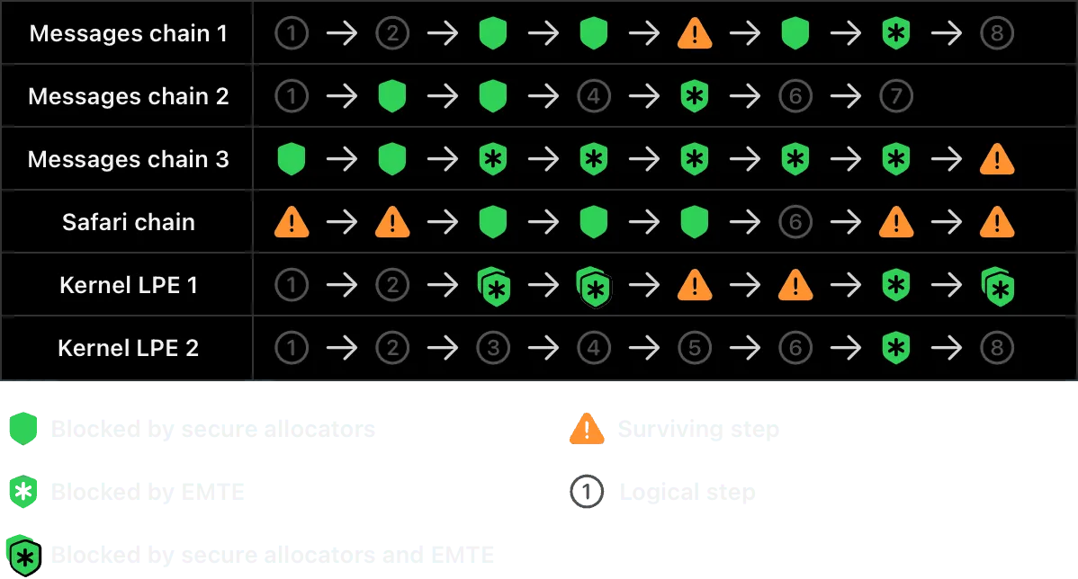 Dodatkowo Apple zaangażował swój zespół ofensywny już od 2020 r. - programowali oni i testowali realne łańcuchy exploitów na prototypach dopóki MIE nie zniweczyło niemal każdego znanego ataku. Dzięki temu nowy mechanizm bezawaryjnie blokuje luki stosowane przez komercyjne spyware, nawet te o poziomie finansowania państwowego.