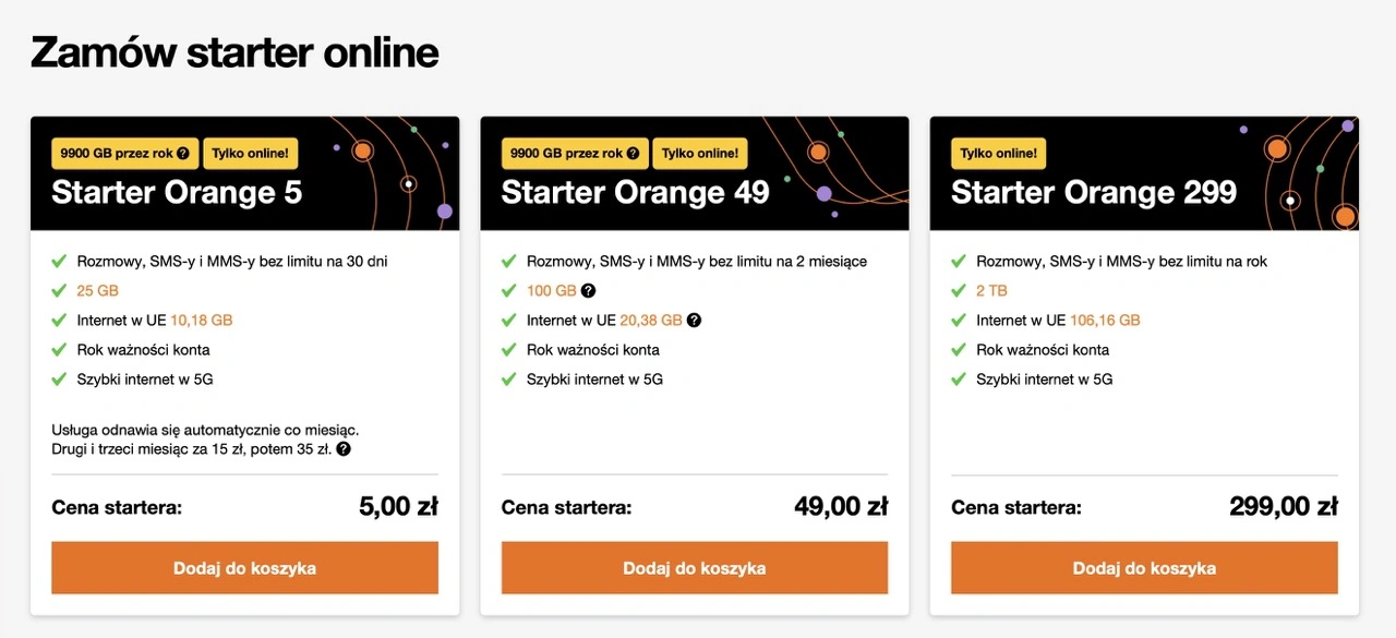 Orange oferuje klientom trzy startery w różnych cenach różniące się usługami, jakie w ich ramach otrzymujemy. Podstawowa taryfa na kartę w Orange w ofercie online, czyli Starter Orange 5 kosztuje tylko 5 zł. W tym przypadku otrzymujemy na miesiąc pakiet no-limits na rozmowy i wiadomości na 30 dni i 25 GB internetu oraz rok ważności konta. Usługa odnawia się automatycznie co miesiąc (drugi i trzeci miesiąc kosztuje 15 zł, potem płacimy 35 zł/mies.)