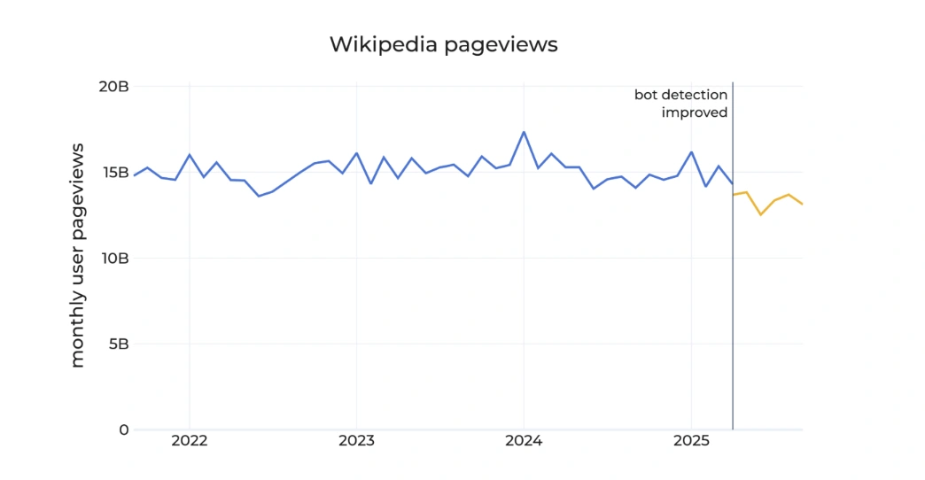 Gdy Wikimedia zaktualizowała swoje systemy wykrywania botów i zastosowała nową wsteczną logikę do danych z marca-sierpnia okazało się, że znaczna część wzrostu ruchu była iluzją. A po usunięciu sztucznego szumu statystyki pokazały coś znacznie bardziej niepokojącego: rzeczywisty ludzki ruch spadł o około 8 proc. w porównaniu z tymi samymi miesiącami w ubiegłym roku.