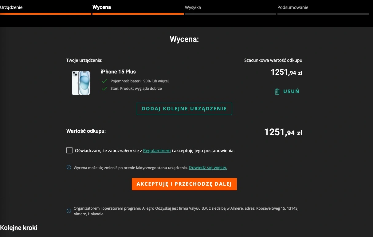Ja dla testu wybrałem swojego prawie dwuletniego iPhone 15 Plus 128 GB z kondycją akumulatora powyżej 90 proc., którego stan oceniam na dobry. Allegro wyceniło to urządzenie na 1251,94 zł. Ile ten sam sprzęt kosztuje w stanie używanym? Na tej samej platformie udało mi się znaleźć oferty zaczynające się od 1800 zł, więc różnica jest.
