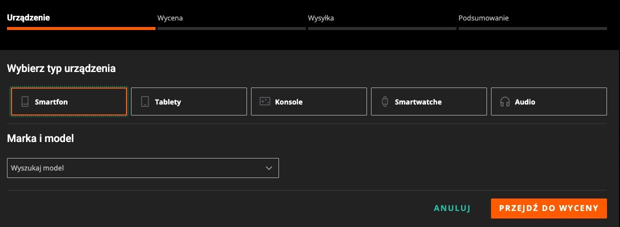 Wybranie jednej z opcji wyświetla dodatkową sekcję marki i modelu. W przypadku smartfonów mamy do wyboru naprawdę ogromny wybór - usługa wspiera większość najpopularniejszych marek oraz modeli. W tabletach znajdziemy sprzęty Samsunga i Apple, a w zegarkach i audio sprzęty marki Apple.