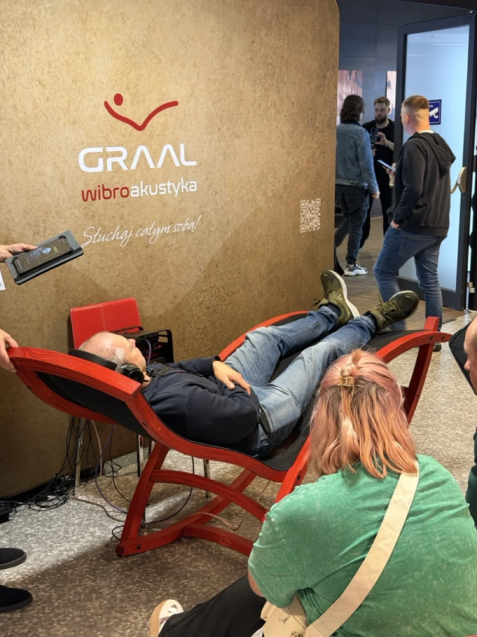 Sporo ludzi zasiadało również przy stanowisku Craft Ears, w których mogli przetestować douszne słuchawki dopasowujące się idealnie do ucha. Graal zachęcał zaś do tego, aby usiąść ze słuchawkami na uszach w… wibroakustycznym fotelu.