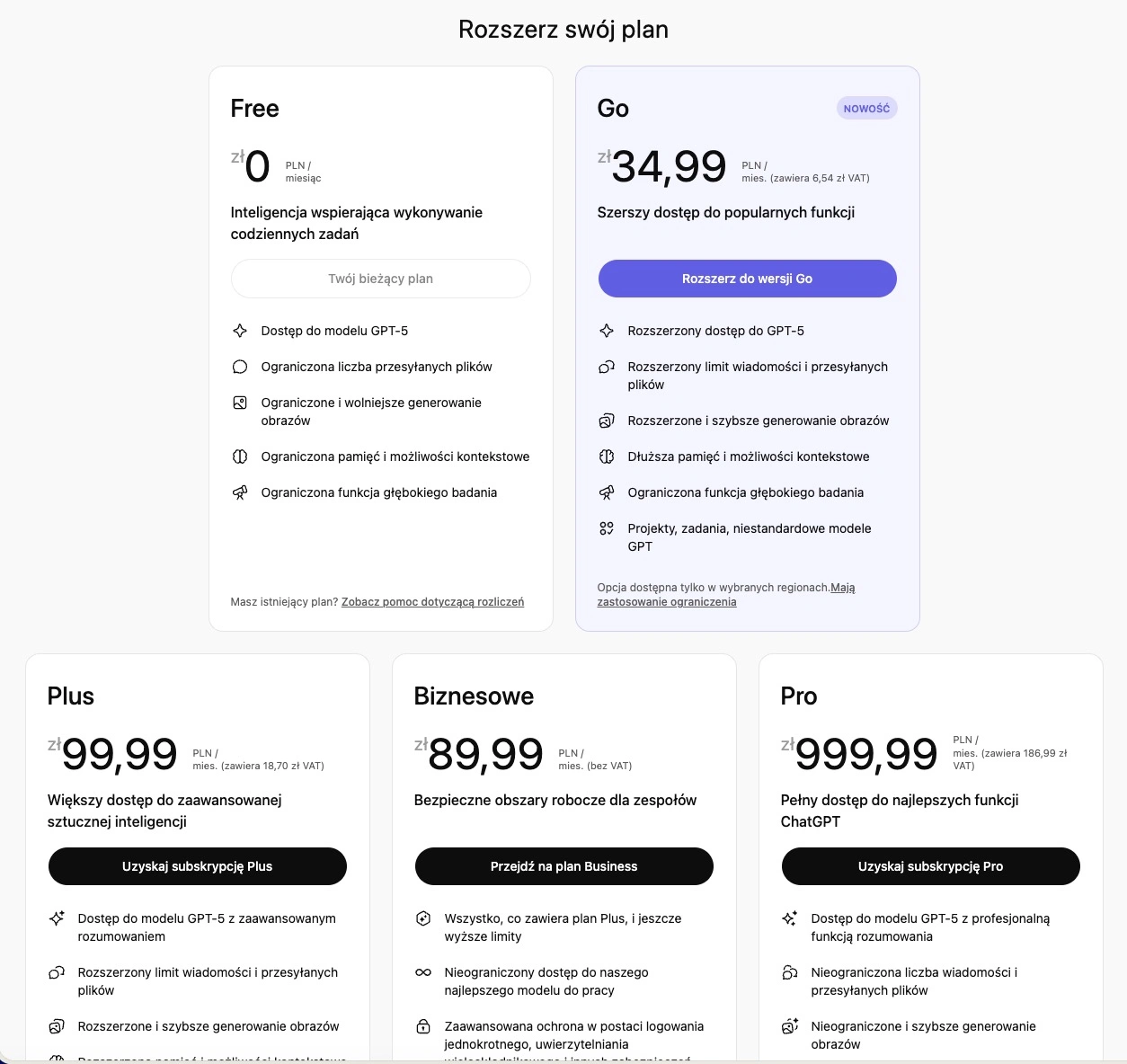 ChatGPT Plus za 100 zł/mies. wyróżnia się jeszcze lepszą pamięcią, dostępem do zaawansowanego rozumowania oraz generowaniem filmów modelem Sora. Jeśli jednak nie potrzebujecie tych funkcji, możliwość oszczędzenia 65 zł/mies. każdego miesiąca jest świetną opcją. Plan ChatGPT Go jest już dostępny w Polsce - aby z niego skorzystać, będzie potrzebna karta płatnicza.