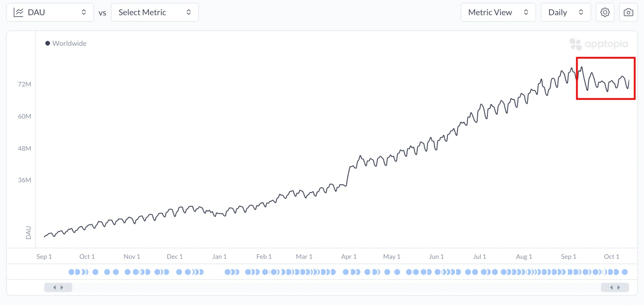 Jak opisuje serwis TechCrunch, zgodnie z danymi Apptopii - platformy analizującej w czasie rzeczywistym dane o aplikacjach - wzrost liczby pobrań mobilnej aplikacji ChatGPT zaczął słabnąć już po kwietniu, a do połowy października liczba pobrań w skali globalnej jest na kursie spadkowym o ponad 8 proc. w stosunku miesiąc do miesiąca.