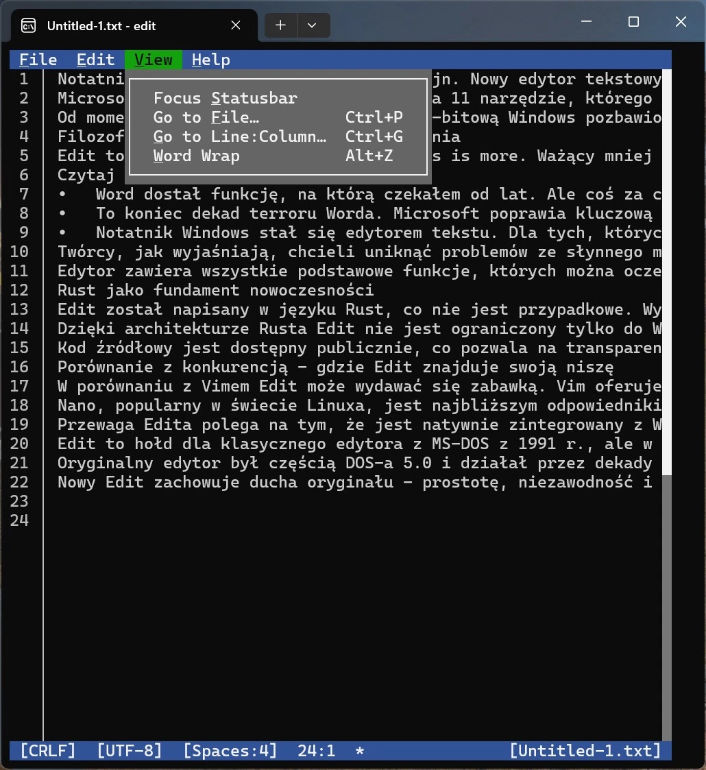Nowy Edit zachowuje ducha oryginału - prostotę, niezawodność i intuicyjność - ale dodaje współczesne funkcje, jak obsługę UTF-8, wieloplatformowość i integrację ze Schowkiem Windows. Edit nie pretenduje do miana rewolucyjnego narzędzia. To praktyczne rozwiązanie konkretnego problemu - braku natywnego edytora CLI w Windowsie. Jego siła leży w prostocie i dostępności, nie w zaawansowanych funkcjach. Edit przypomina, że prostota może być cnotą.