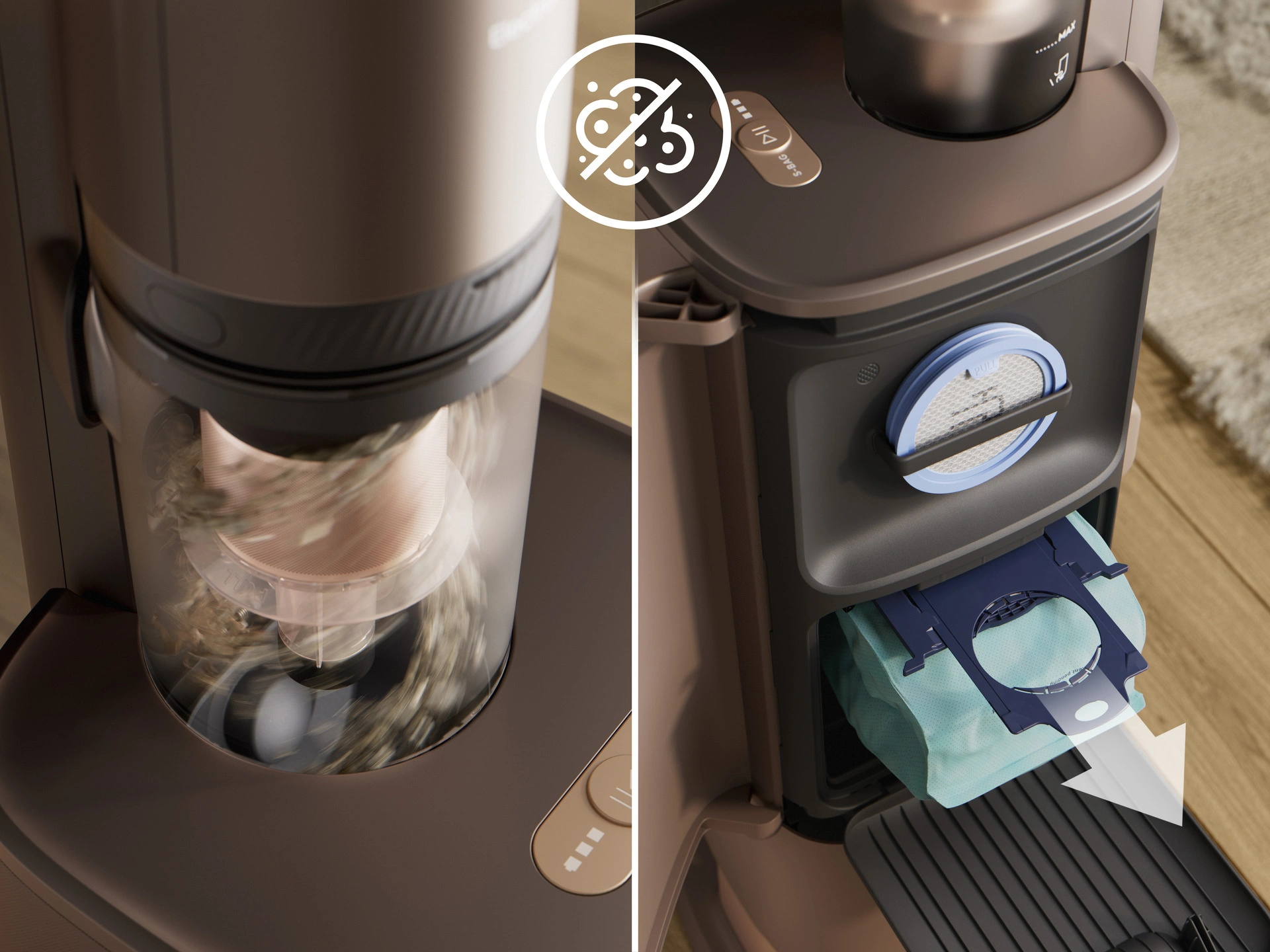 Atutem odkurzacza jest zintegrowana stacja ZeroDust, która automatycznie, bezdotykowo i z dużą mocą opróżnia pojemnik odkurzacza. Dzięki temu nie macie żadnego kontaktu z kurzem, nawet podczas opróżniania pojemnika. To duży plus, bo wiele odkurzaczy na rynku wymaga ręcznego wysypywania zebranych odpadów, co kończy się tym, że i tak do waszych płuc trafiają mikrocząsteczki kurzu. Tymczasem odkurzacz ELECTROLUX Absolute Hygienic 800 umożliwia przeprowadzenie całego procesu bez żadnej interakcji z kurzem. Wszystko, co usunie stacja ZeroDust, trafia do hermetycznego worka S-bag, którego pojemność wystarcza nawet na 8 tygodni sprzątania.
