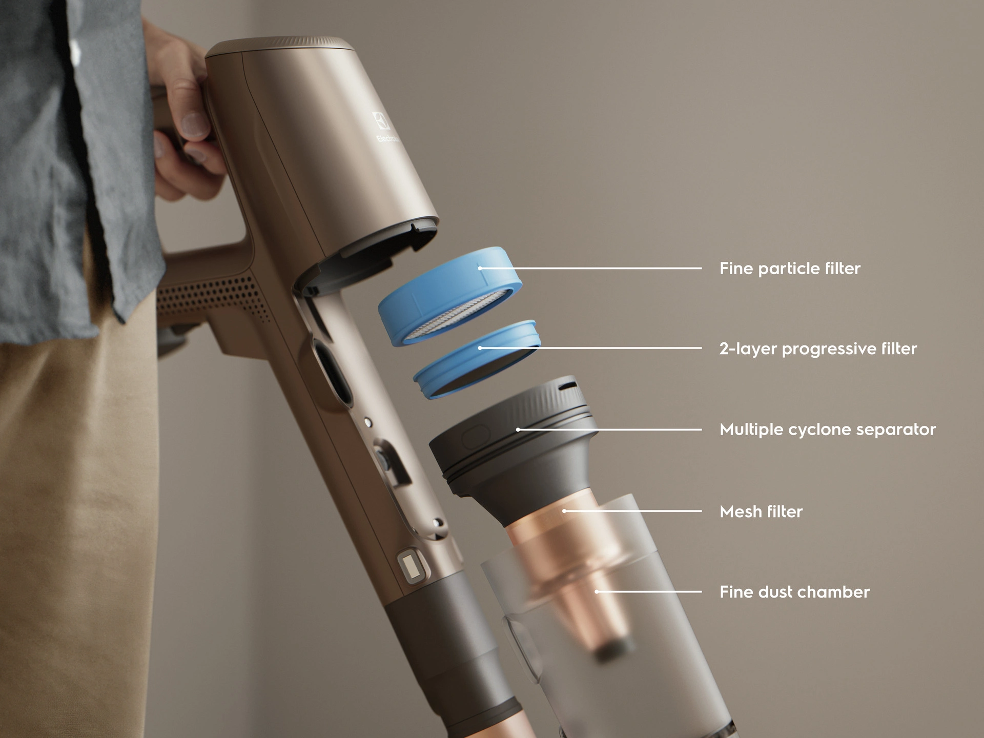 Odkurzacz dysponuje 6-warstwowym systemem filtracji NexGen, który wychwytuje do 99,99 proc. cząsteczek. Składa się z komory drobnych cząsteczek, filtra siatkowego, separatora wielocyklonowego, 2-warstwowego filtra progresywnego oraz filtra drobnych cząstek stałych. Technologia cyklonowa wykorzystuje siłę odśrodkową do perfekcyjnego oddzielania cząsteczek brudu od powietrza, a wszystkie filtry są zmywalne, co ułatwia konserwację.