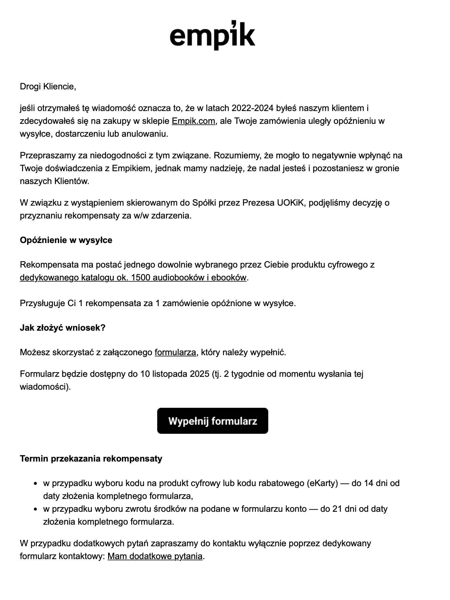 Wszyscy uprawnieni otrzymali powiadomienie na maila (lub SMS-a) na adres powiązany z kontem w Empiku. Jeśli nie otrzymaliście takiej wiadomości, oznacza, że nie możecie liczyć na wynagrodzenie, ponieważ sprawa was nie dotyczy i żadne wasze zamówienie nie zostało anulowane lub opóźnione.