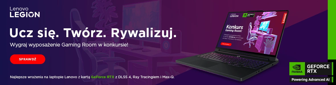 Aktualnie trwa doskonała okazja, dzięki której można go zdobyć, czyli organizowany przez LeEnovo Legion i NVIDIA konkurs „Gaming Room. Jego zwycięzca otrzyma nie tylko najnowszego laptopa Legion Pro 7i z GeForce RTX 5090, ale także kompletną metamorfozę pokoju w prawdziwe centrum gamingu wraz z niezbędnymi dodatkami i akcesoriami. Co więcej, nagrodę wręczą osobiście autorzy popularnych kanałów Do Roboty oraz Matura to bzdura, którzy zadbają również o pełne wyposażenie pokoju w nowy sprzęt. Warto też dodać, że pierwsze 30 zgłoszeń otrzyma plecak Lenovo Casual Backpack B210 idealny na laptopa. Konkurs potrwa od 7.10.2025 do 26.10.2025, a szczegóły akcji można znaleźć na stronie organizatora.
