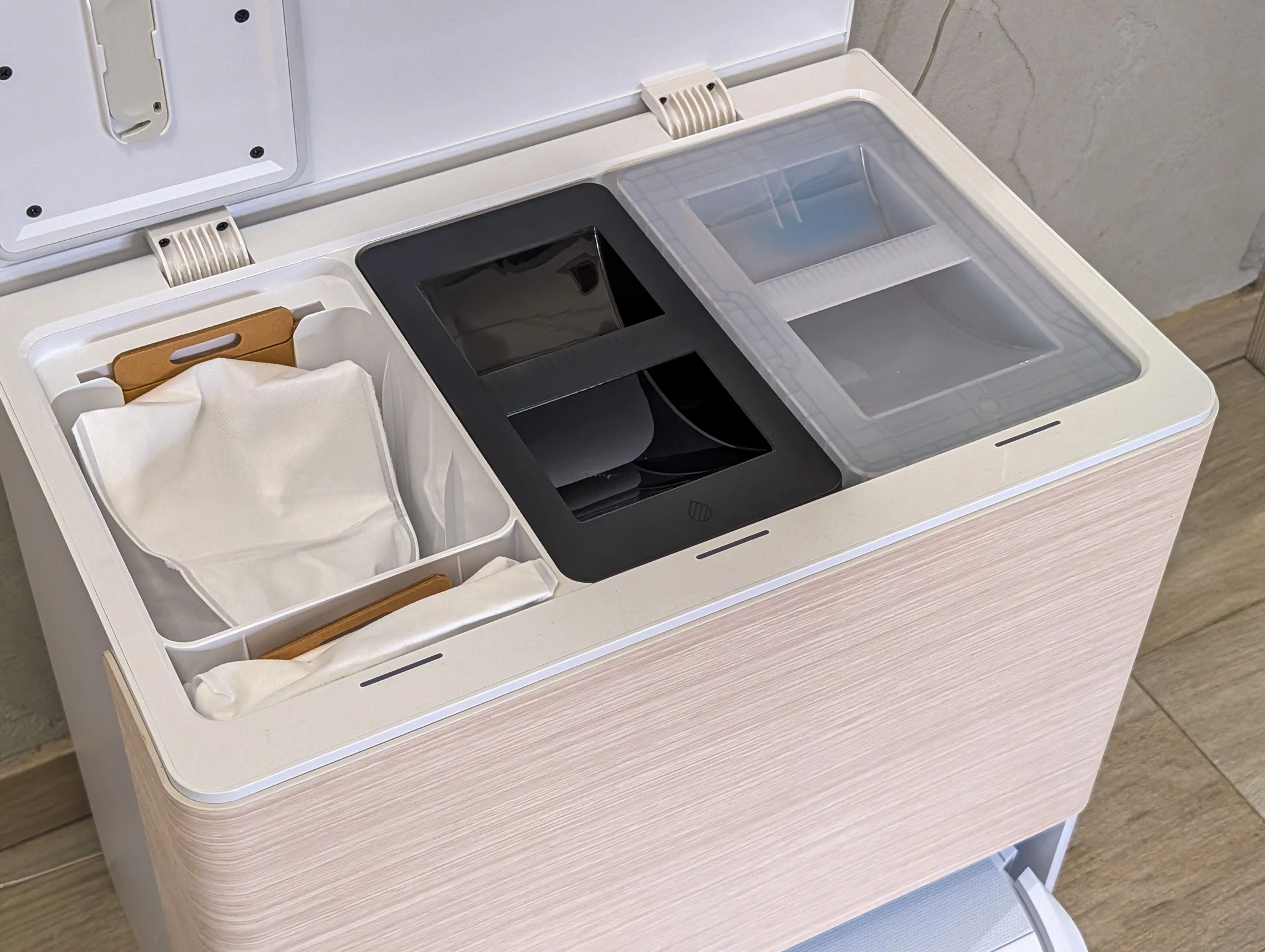 A sama stacja? Ma dwa pojemniki - jeden na brudną wodę, drugi na czystą. W nim znajduje się również dozownik detergentu, który znajdziecie dołączony do odkurzacza. Oprócz niego znajdziecie również dwa komplety szczotek bocznych oraz zapasowy filtr EPA. W stacji znajduje się również dodatkowy worek i tu chciałbym pogratulować iRobotowi przemyślanego ruchu. Otóż w przeciwieństwie do zdecydowanej większości odkurzaczy znajdujących się na rynku worek nie znajduje się w środkowej części stacji, do której dostęp jest utrudniony. Tutaj znajduje się u góry, a obok niego wygospodarowano przegródkę na dodatkowy worek, a na pokrywie od środka znalazła się szczotka do czyszczenia odkurzacza. Może nie są to spektakularne rozwiązania, ale podnoszą komfort korzystania z urządzenia.