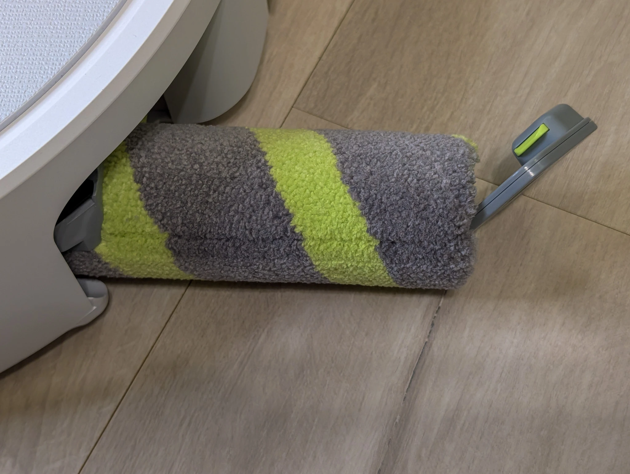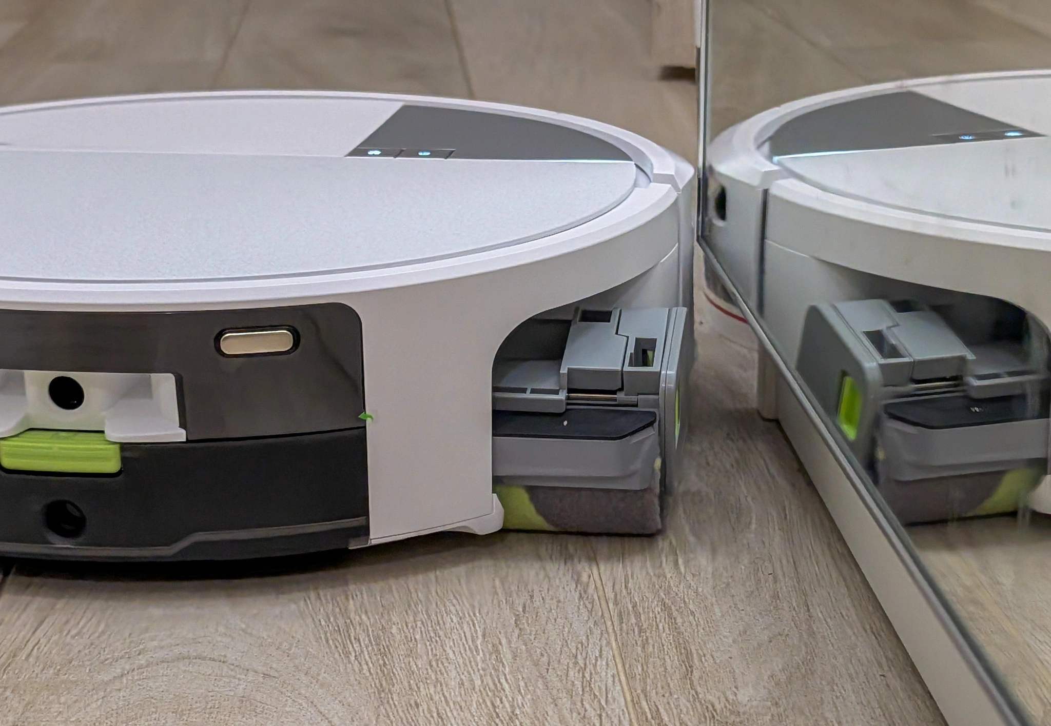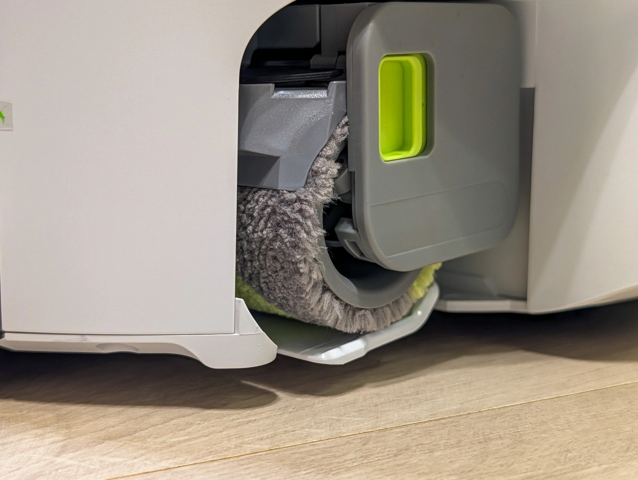 To jednak nie wszystko. Wałek jest wysuwany, dzięki czemu jest w stanie dotrzeć do samej krawędzi pomieszczenia. Tym samym nie dojdzie do sytuacji, w której macie pięknie posprzątany środek pokoju i brud w zakamarkach. Zapytacie, wszystko fajnie, ale co z dywanami? Sprawdziłem - w razie wykrycia dywanu wałek jest zasłaniany specjalną osłonką, co zapobiega zamoczeniu tkaniny.