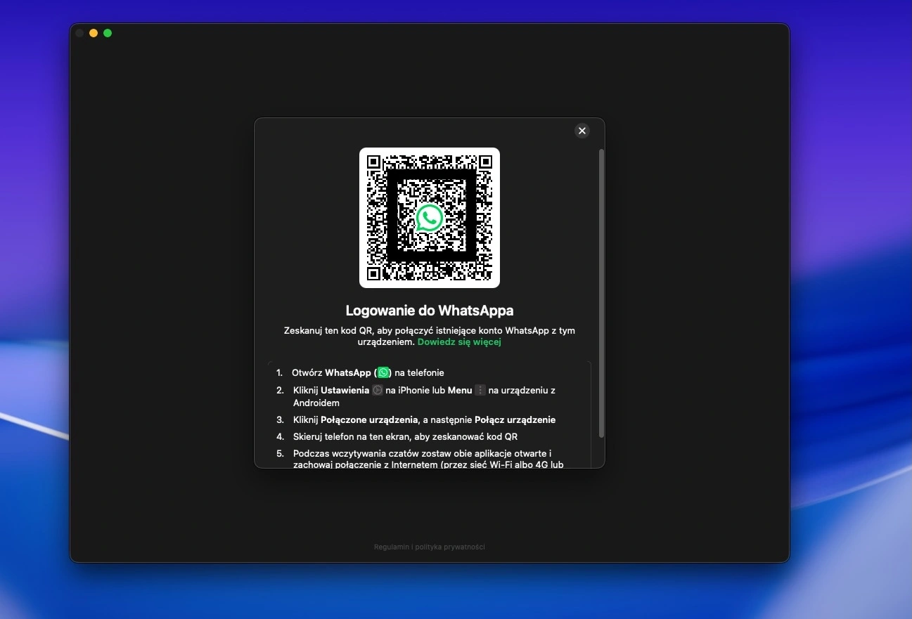 Po pierwszym uruchomieniu WhatsApp na komputerze pojawi się duży kod QR. Następnie wykonaj kilka prostych kroków: