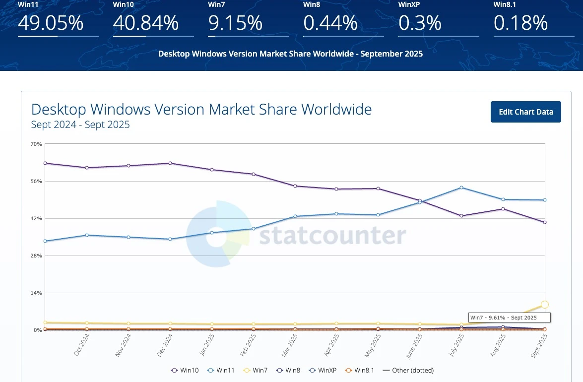 Windows 11 ma 49 proc. udziału na rynku, a Windows 10 - niespełna 41 proc. We wrześniu 2025 r. doszło do dziwnej sytuacji i nagle wzrosła popularność starszego Windowsa 7, którego wsparcie zakończyło się na początku 2020 r. Przez dłuższy czas udział oprogramowania wynosił ok. 2 proc., natomiast w sierpniu wzrósł do 3,6 proc., a we wrześniu do aż 9,15 proc. Oznacza to, że niemal co dziesiąty komputer na rynku korzysta z systemu wydanego w 2009 r. - 16 lat temu.