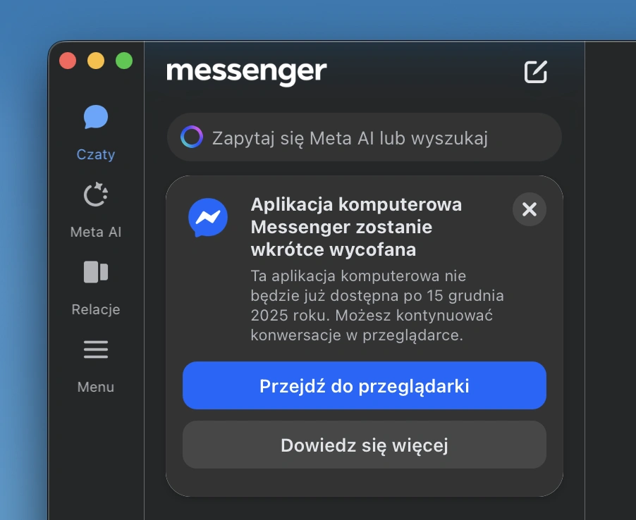 Oznacza to, że Messenger wraca tam, skąd przyszedł - do przeglądarki. A dla Mety to symboliczny koniec pewnego eksperymentu: próby stworzenia pełnoprawnego desktopowego klienta komunikatora, który koniec końców nigdy nie dorósł do oczekiwań użytkowników.