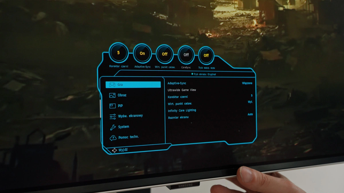 Funkcje gamingowe wykraczają poza same parametry techniczne .Wirtualny celownik może być kluczowy w grach FPS gdzie broń nie ma własnego przyrządu celowniczego, a korektor czerni pozwala dostroić widoczność w ciemnych scenach bez utraty autentyczności kolorów.