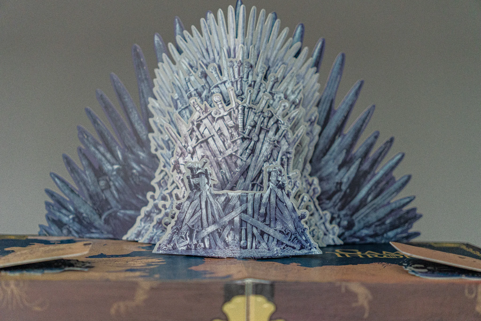 Już samo opakowanie zdradza, z jak niezwykłym produktem mamy do czynienia. Zamiast standardowego kartonu, otrzymujemy ciężką, pseudodrewnianą skrzynię i złotymi, rzeźbionymi zdobieniami, inspirowaną kufrem, w którym Daenerys Targaryen przechowywała swoje smocze jaja. Na wieku widnieje metalowa, trójwymiarowa nazwa serialu, a całość zdobią herby dziewięciu wielkich rodów Westeros.