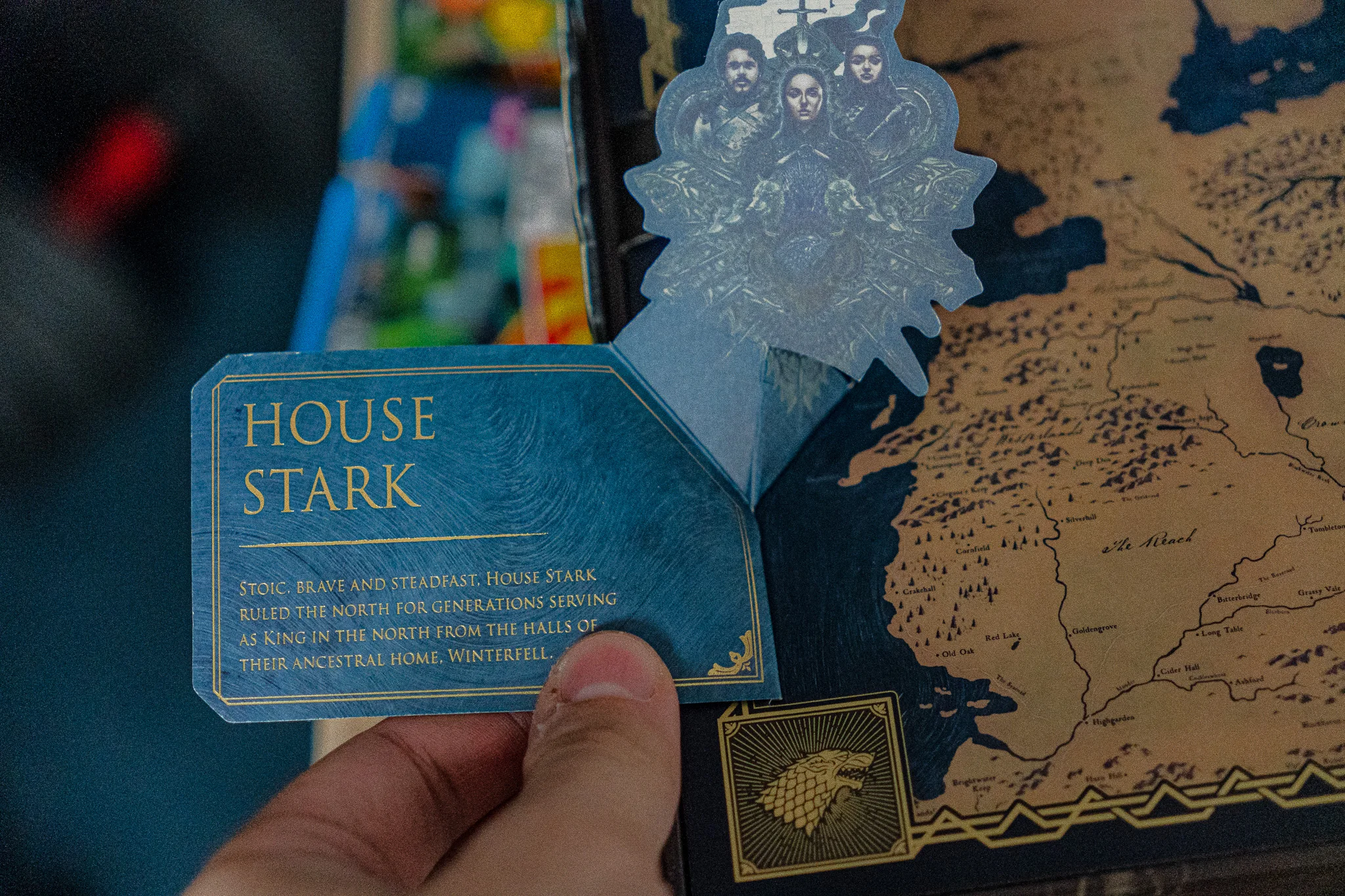 Po bokach znajdują się stylizowane wprowadzenia do historii rodów Starków i Targaryenów oraz misternie wykonana mapa Westeros.