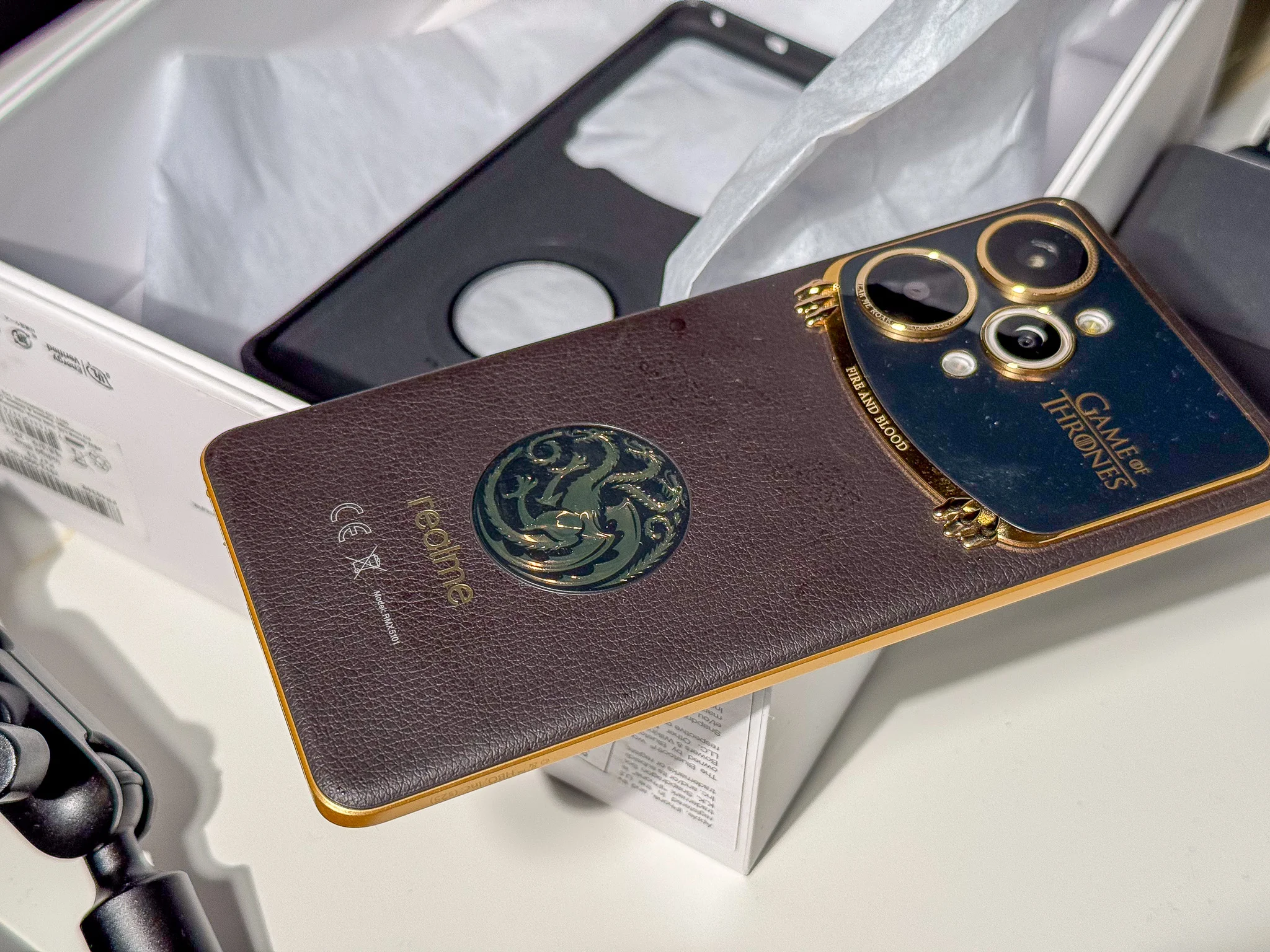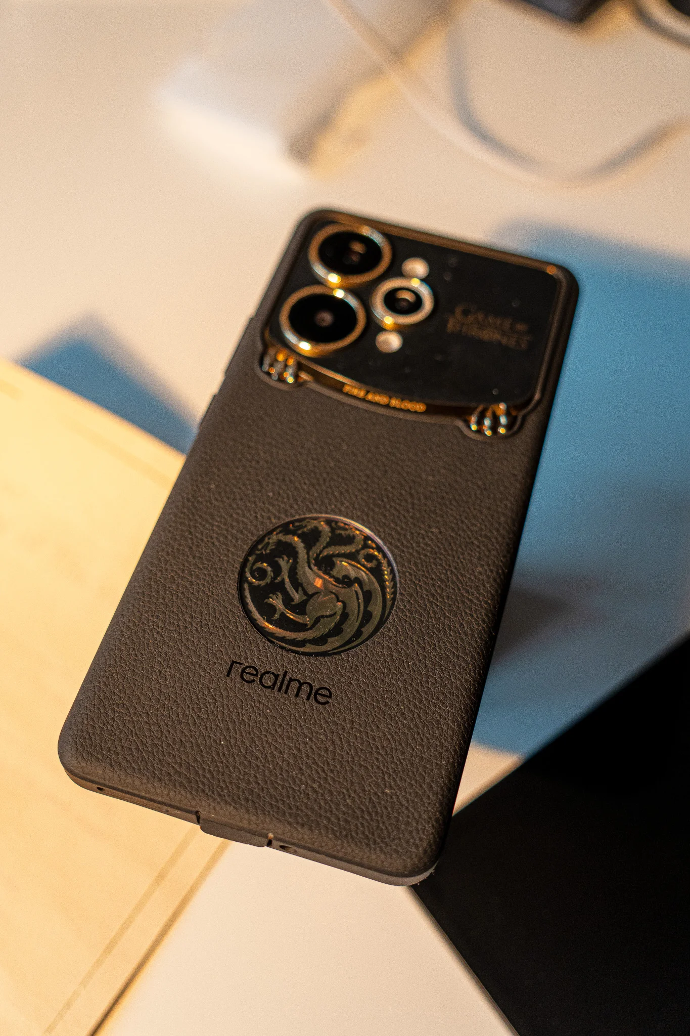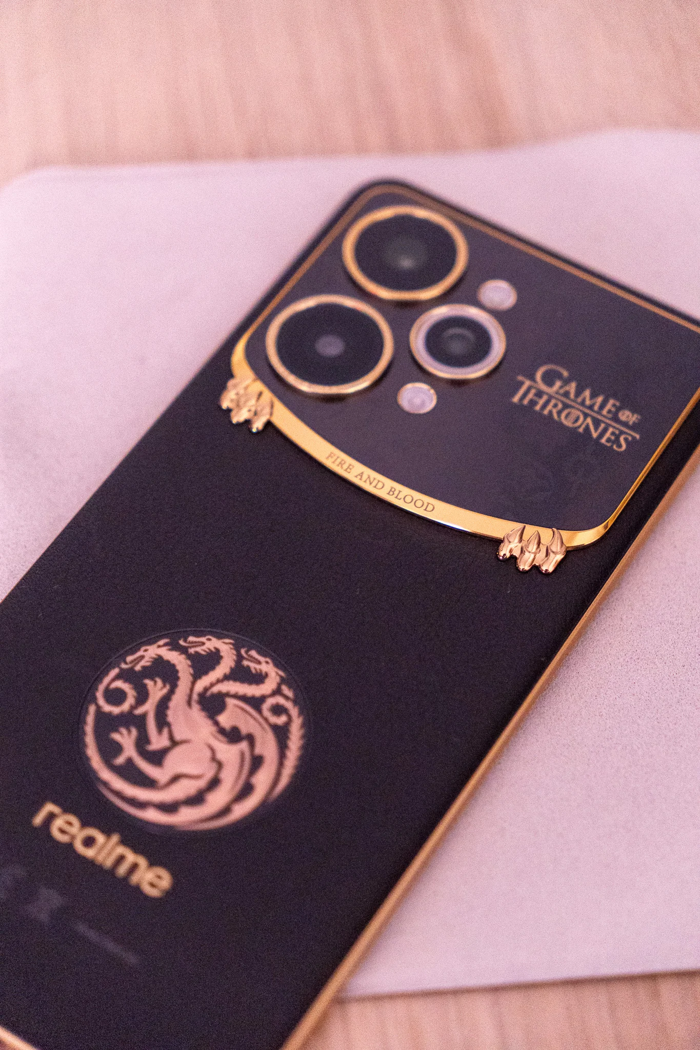 Smartfon realme 15 Pro w edycji GOT utrzymany jest w estetyce Golden-in-black, gdzie czerń smoczej skóry kontrastuje ze złotymi akcentami.