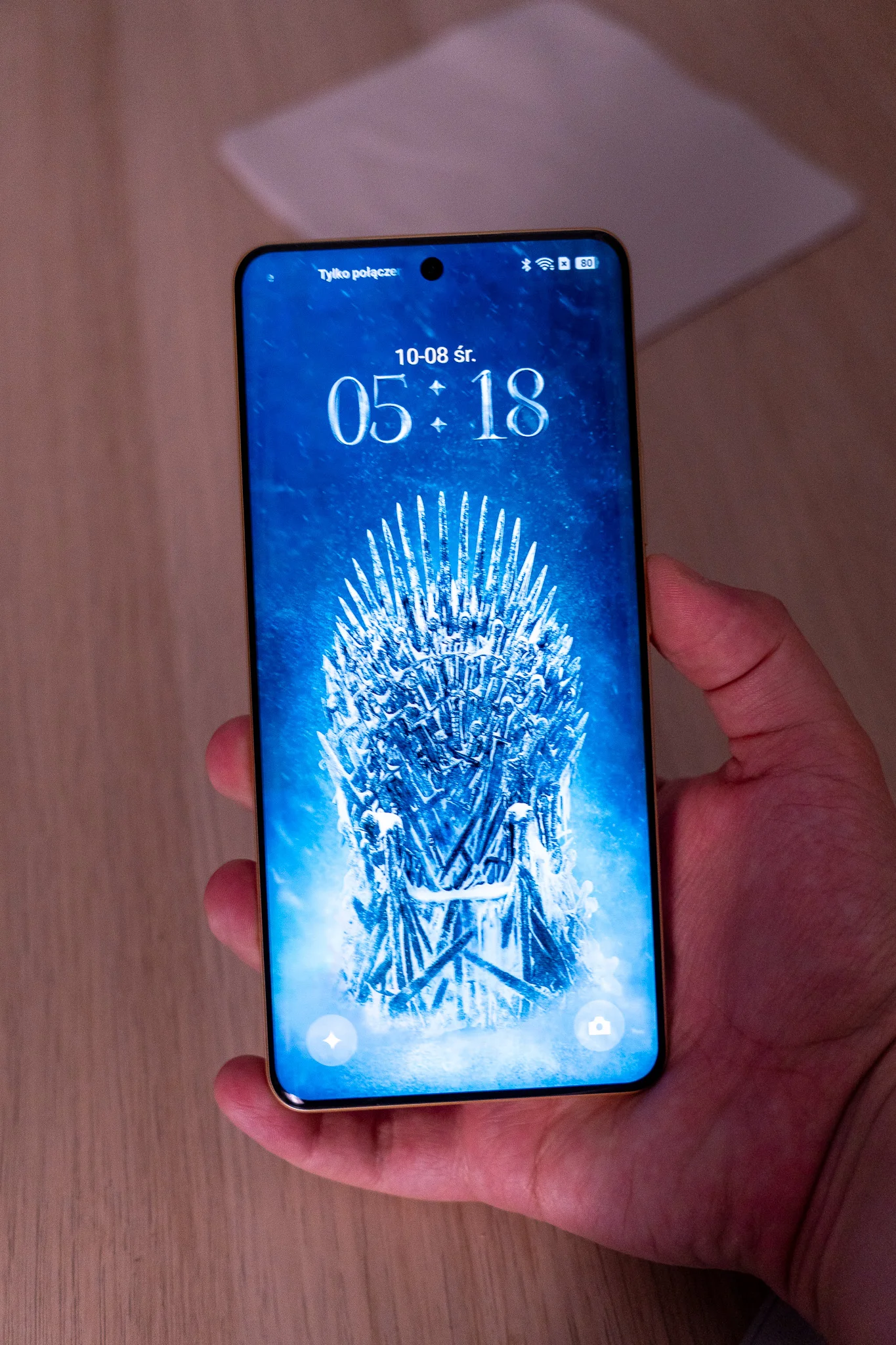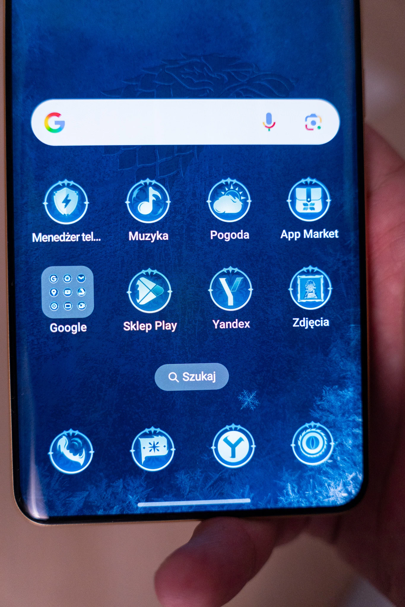 Personalizacja obejmuje niemal każdy element: od niestandardowych ikon (Telefon, Wiadomości, Aparat), przez animację odblokowania odciskiem palca, po ekran Always-On Display prezentujący herby rodów. Nawet animacja ładowania dynamicznie przeplata motywy lodu i ognia. Specjalną animację z efektem paralaksy otrzymał też tryb GT, czyli funkcja zwiększania wydajności.