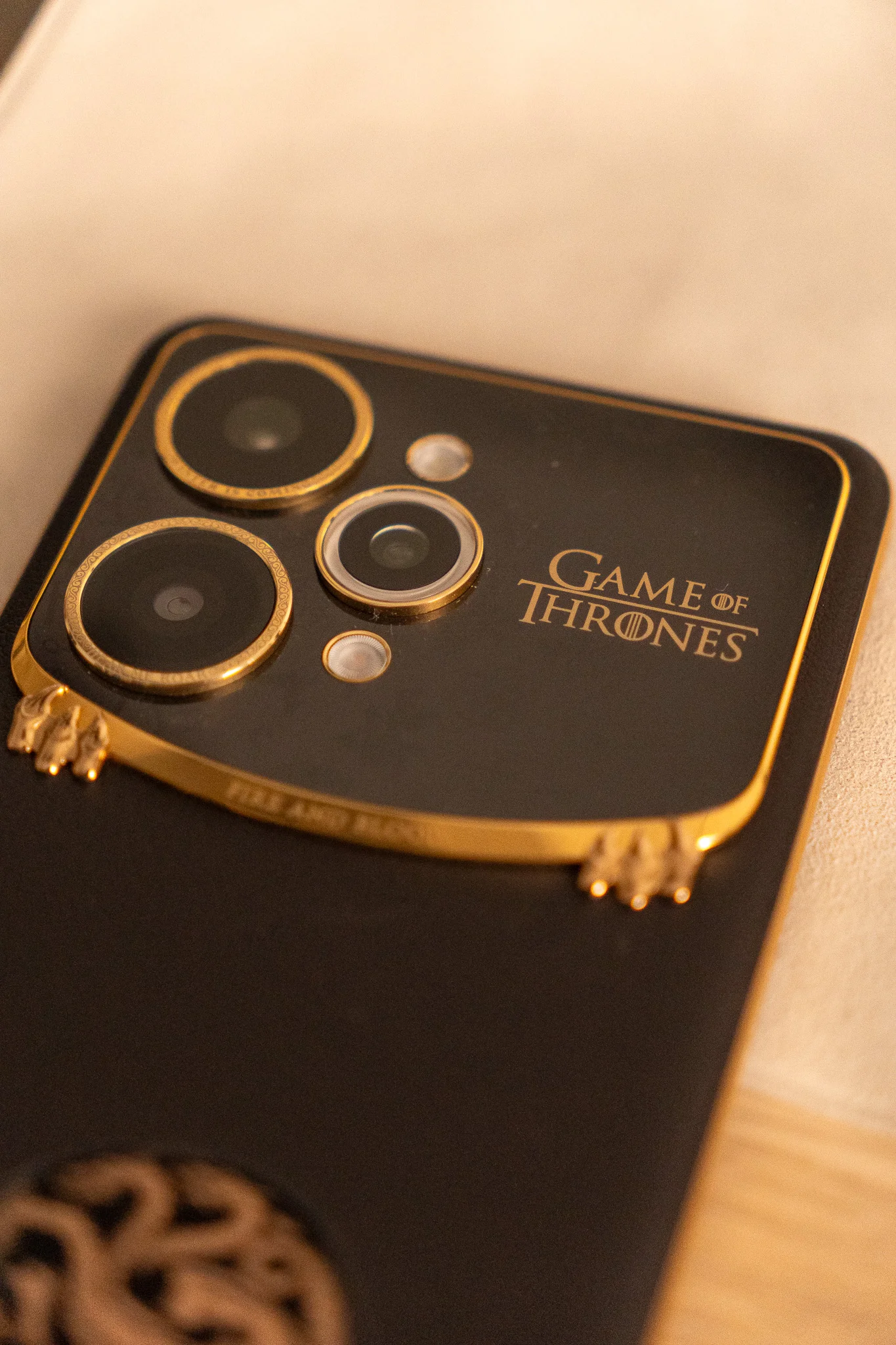 Tylny panel pokryto miękką, przyjemną w dotyku sztuczną skórą z fakturą inspirowaną smoczą łuską, na której wytłoczono trójwymiarowy, złoty herb rodu Targaryenów. Całość otacza płaska, złota ramka z aluminium, a smukła konstrukcja (zaledwie 7,84 mm grubości) sprawia, że telefon świetnie leży w dłoni.