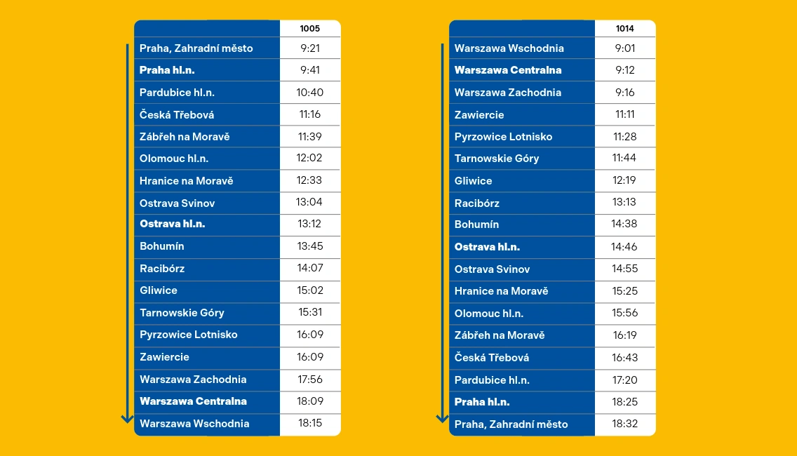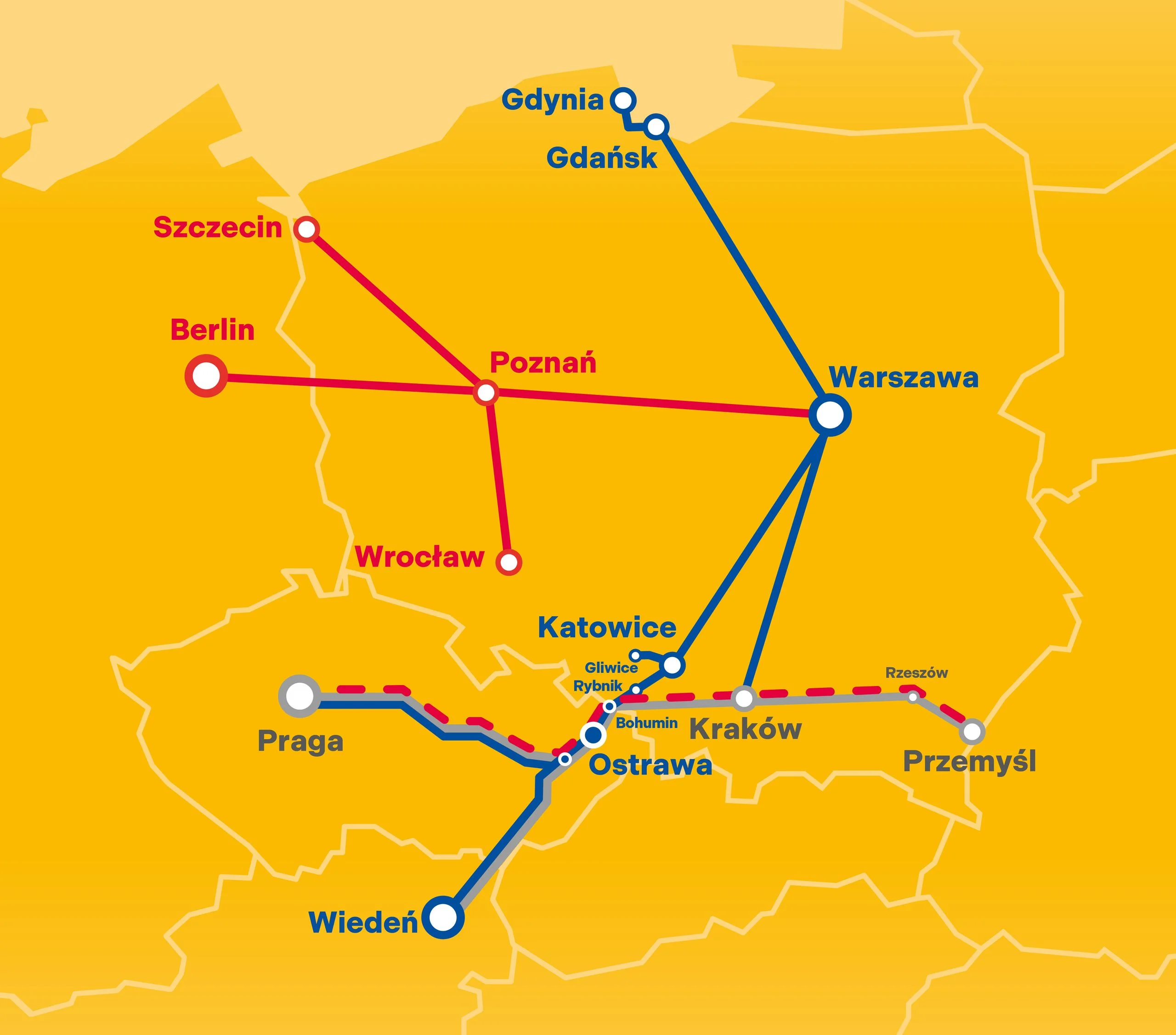 - Gdynia – Gdańsk – Warszawa – Katowice – Ostrawa – Břeclav – Wiedeń