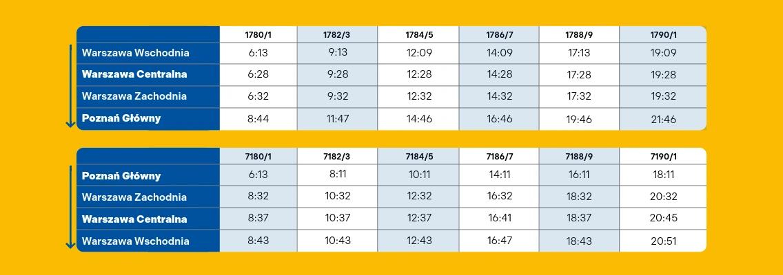 - Warszawa – Poznań (sześć par połączeń dziennie)