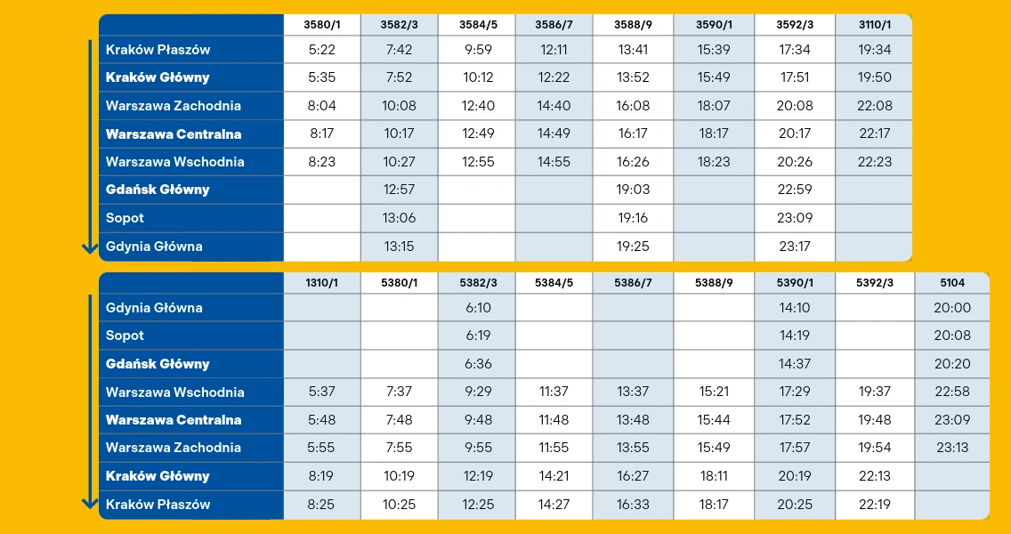 - Kraków – Warszawa – Gdynia (trzy pary połączeń dziennie)