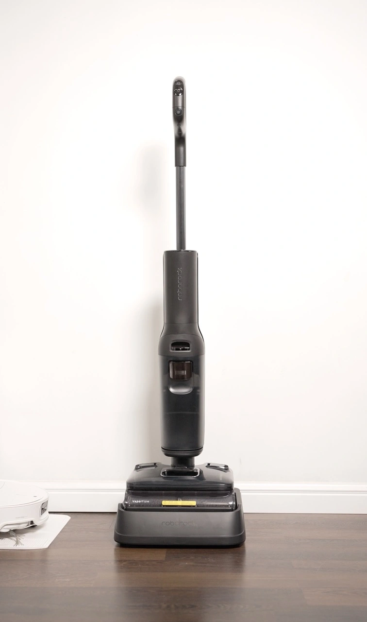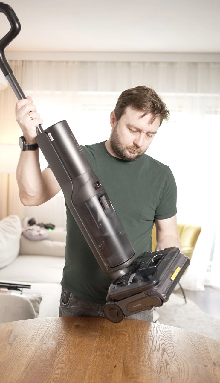 Niezwykle zadowolony jestem również z tego, że Roborocka F25 Ultra można zaparkować w dowolnym momencie, gdy np. musimy odebrać telefon albo otworzyć drzwi do domu. Po ustawieniu rączki w pozycji pionowej praca jest przerywana. Aby ją wznowić wystarczy rączkę wychylić do tyłu, a urządzenie od razu pracuje dalej w wybranym przez nas trybie. Wszystko jest tutaj na swoim miejscu.