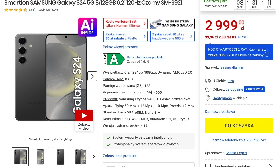 Za sprzęt z własnej kieszeni na początku zapłacimy 2999 zł, ale ze zwrotem 1000 zł urządzenie będzie nas kosztować 1999 zł. Jest też wyższy wariant pamięciowy Galaxy S24 8/256 GB w cenie o 113 zł wyższej. Nawet za 2112 zł urządzenie jest łakomym kąskiem. To przecież sztandarowy model z ubiegłego roku.