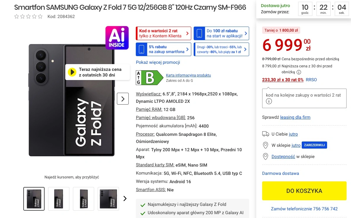 Samsung Galaxy Z Fold 7 w cenie 6999 zł jest dostępny w wielu sklepach: Media Expert, x-kom oraz bezpośrednio u Samsunga. Ceny powinny obowiązywać zarówno w sklepach internetowych, jak i stacjonarnych oddziałach wymienionych sieci.