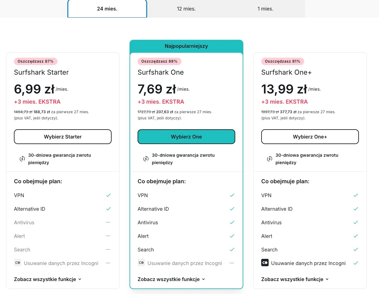 - Surfshark One - 7,69 zł/mies. + VAT (255,38 zł płatne z góry) - 88 proc.;