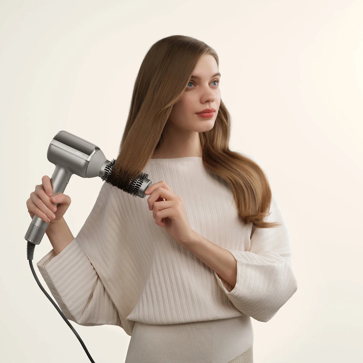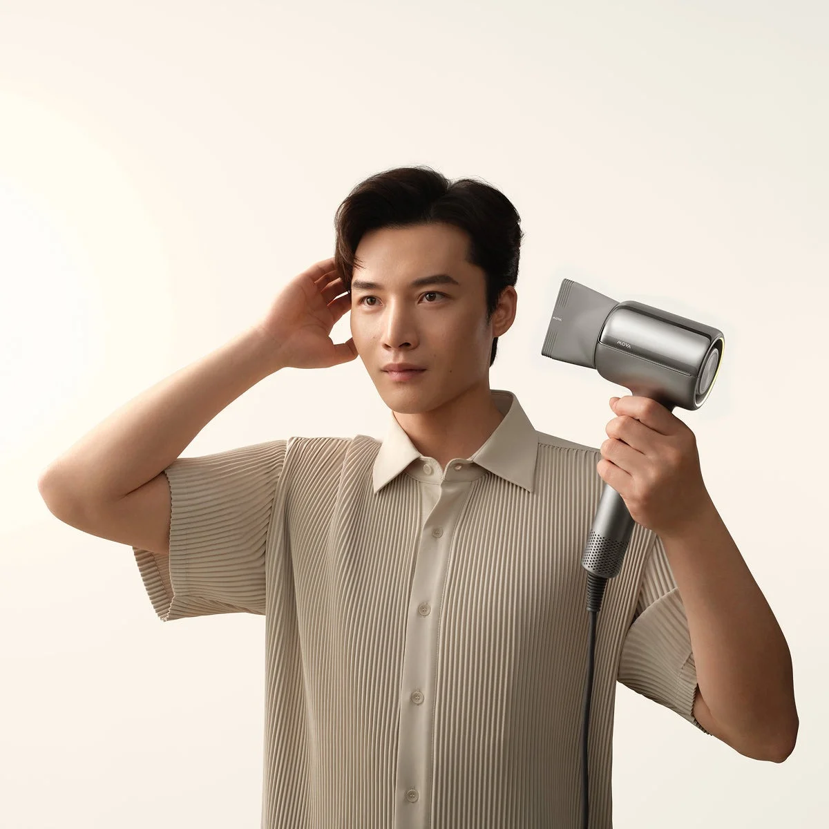 To urządzenie rodem z profesjonalnego zakładu fryzjerskiego, które nie tylko suszy włosy, ale jest domowym asystentem w stylizacji. Zacznijmy jednak od początku. Suszarka korzysta z bezszczotkowego silnika, który potrafi osiągnąć aż 110 tys. obr/nim i wygenerować wiatr o prędkości do 55 m/s oraz przepływ powietrza 50 m³/h. Umożliwia to niezwykle szybkie i wydajne suszenie, bo krótkie włosy są suche po 40 s, a długie potrzebują zaledwie 4 minut. Jednocześnie suszarka jest bardzo lekka, bo waży zaledwie 292 g. Jak udało się osiągnąć takie wyniki?