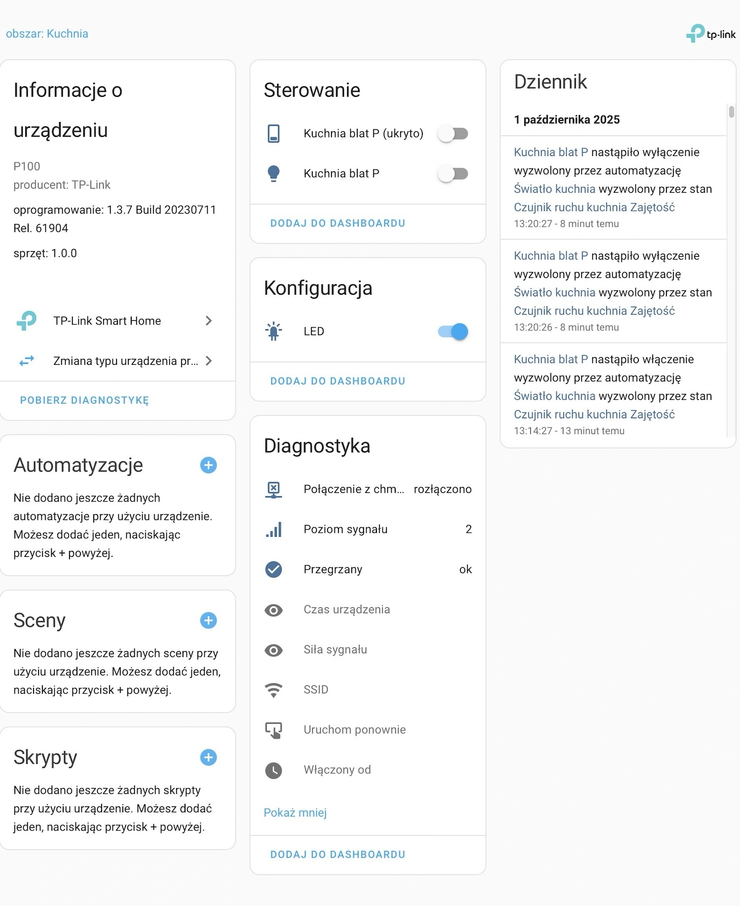 Mało? Teoretycznie tak, ale w praktyce jest to świetne rozwiązanie dla podstawowego sterowania urządzeniami, które nie mają innych stanów niż "włączony" i "wyłączony". Przykładowo u mnie w kuchni do Tapo P100 podłączone są zasilacze kuchennych LED-ów, a te z kolei powiązane są z czujnikami ruchu w tym samym pomieszczeniu. Wykrycie ruchu aktywuje P100, a wtyczka włącza LED-y. Brak ruchu przez określony czas - sygnał dla P100, żeby te LED-y wyłączyć. Proste, bardzo wręcz podstawowe, ale i działające idealnie tak, jak trzeba.
