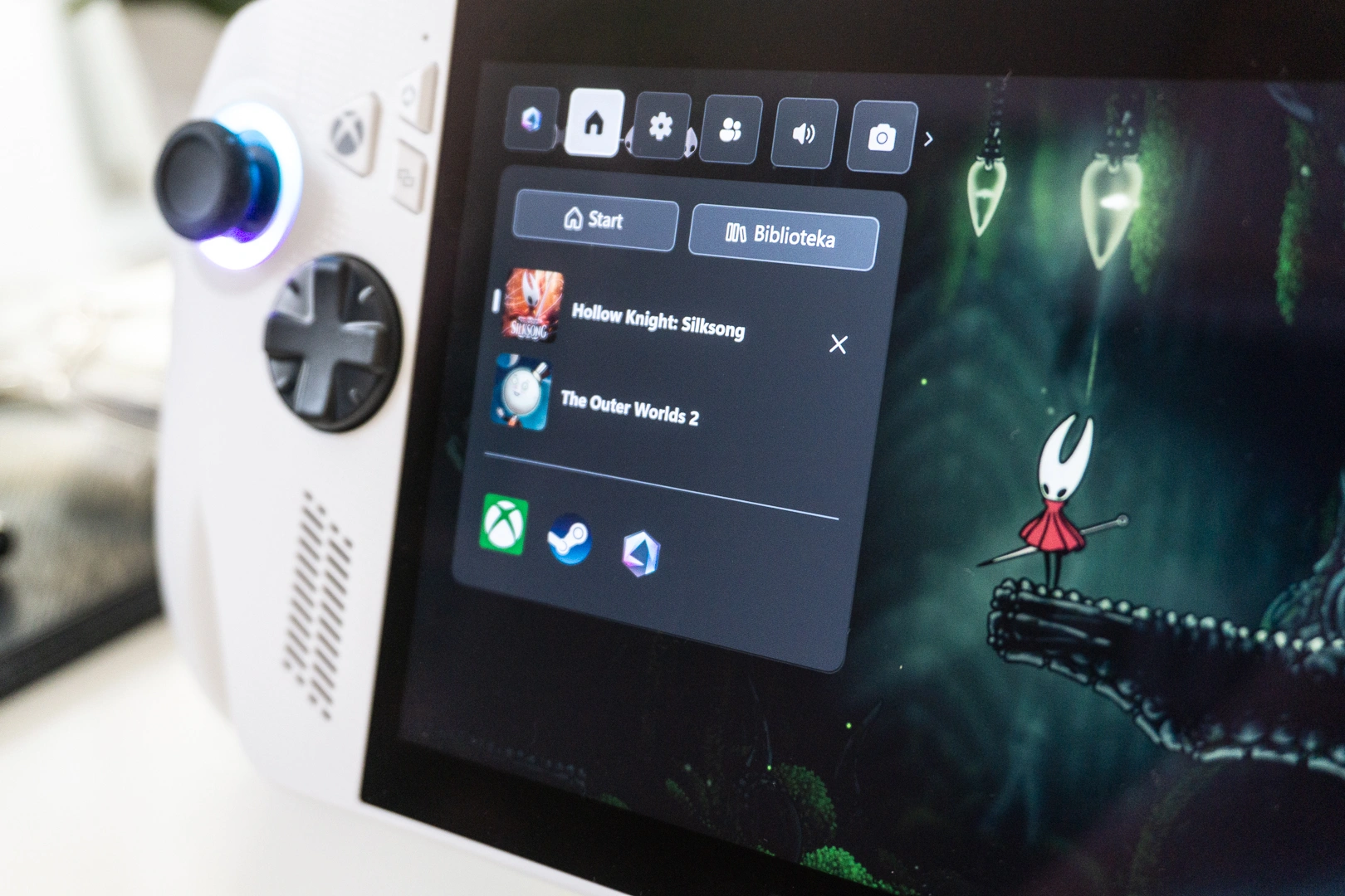 Za najlepszy uznaję możliwość szybkiego przełączania między aplikacjami, w trybie pełnoekranowym. Skaczę między Cyberpunkiem, Silksong, Ustawieniami oraz Armoury Crate przy pomocy czytelnego menu, dopasowanego do sterowania analogiem. Z poziomu tego miejsca mogę też błyskawicznie ubić każdy uruchomiony progam, wciskając przycisk X. Co bywa przydatne, biorąc pod uwagę jak łatwo otworzyć masę różnych okien na Windows 11.