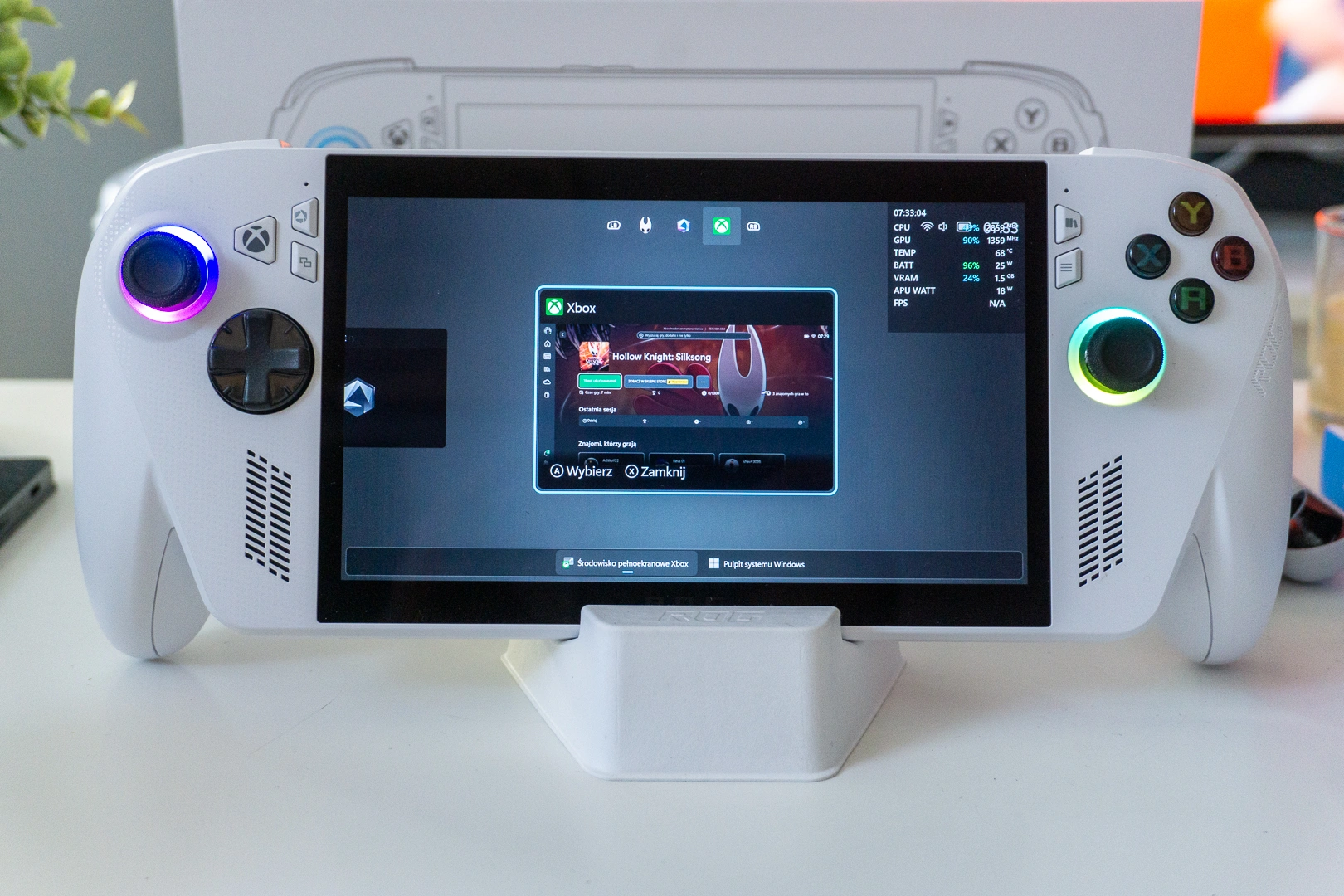 Trzeba tylko mieć na uwadze, że posiadanie kilku jednocześnie uruchomionych gier potężnie odciska piętno na wydajności. To nie Xbox Series, nie ma tu systemowego Quick Resume. Przykładowo, Cyberpunk 2077 w 720p na niskich ustawieniach, bez innej gry w tle, działa w 40 fps. Jeśli jednak w tle mam włączone Follow Knight Silksong, liczba klatek spada do 35.