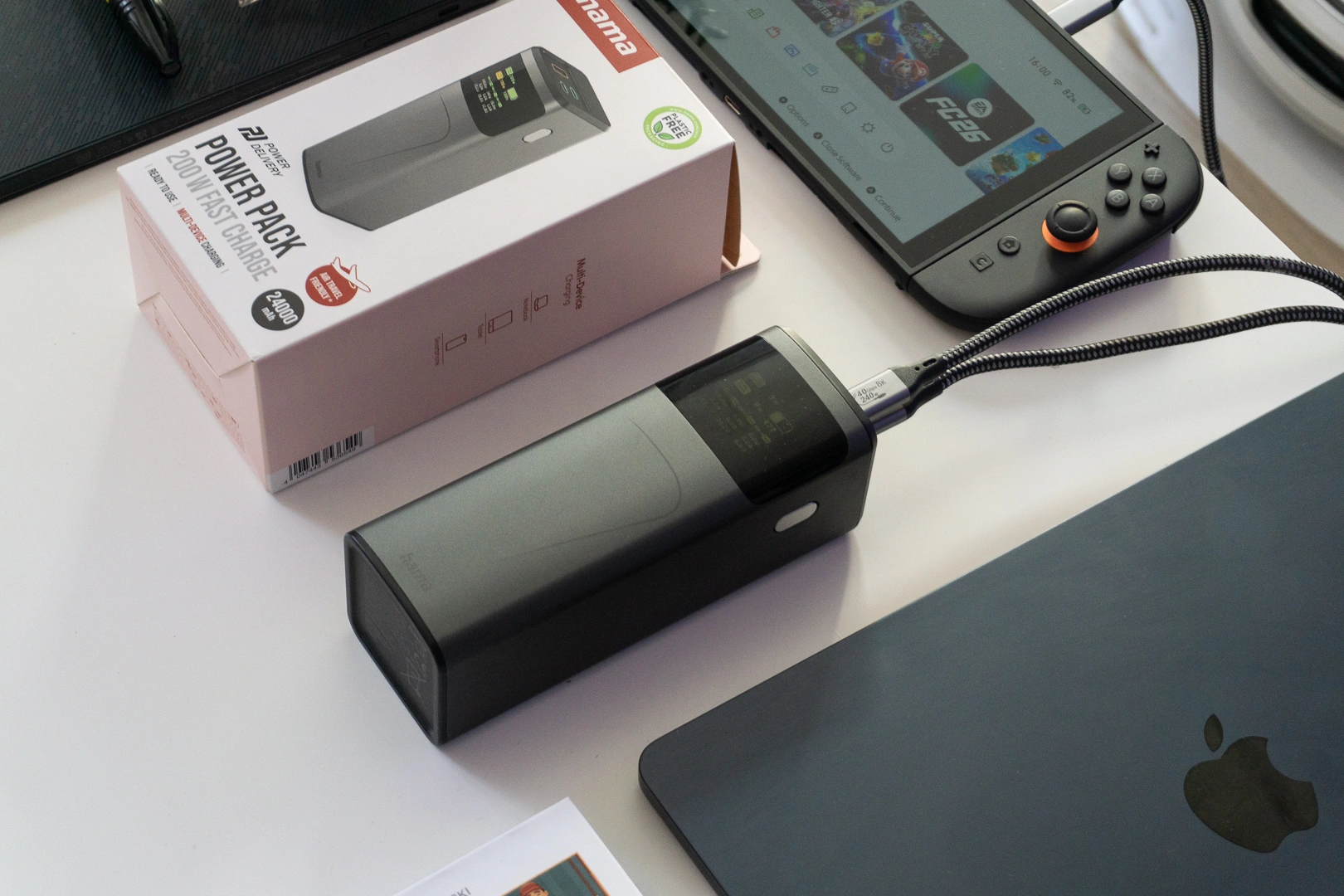 Hama High Power 200W bez problemu zasili takie urządzenia jak laptopy, tablety czy konsole do gier. Co więcej, z łączną mocą na poziomie 200W, powerbank może jednocześnie ładować najnowszego MacBooka Air, konsolę Nintendo Switcha 2 oraz zegarek Apple Watch Ultra 2, wszystko z maksymalną prędkością. No, klasyczny port USB 18W minimalnie spowalnia ładowarkę Watcha, ale mówimy o praktycznie maksymalnych parametrach.