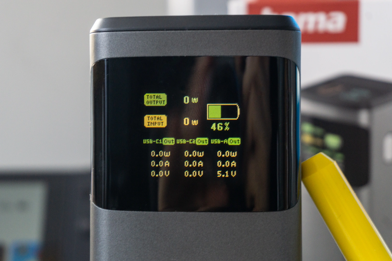 Hama High Power 200W to sprzęt wyposażony w kolorowy ekran TFT, aktywowany bocznym przyciskim na obudowie. Po jego wciśnięciu, wyświetlacz przez kilka sekund pokazuje istotne dane na temat powerbanka oraz procesu zasilania:
