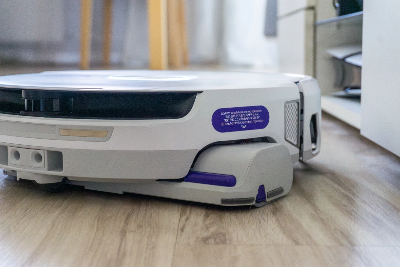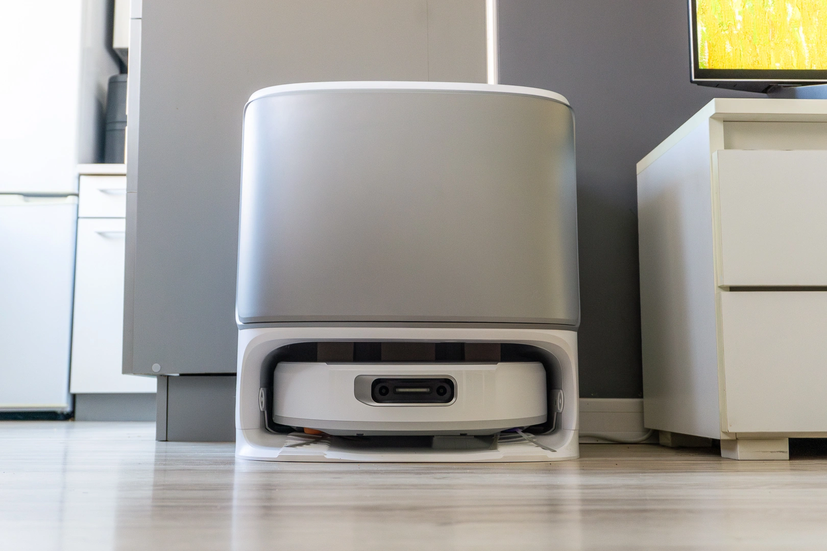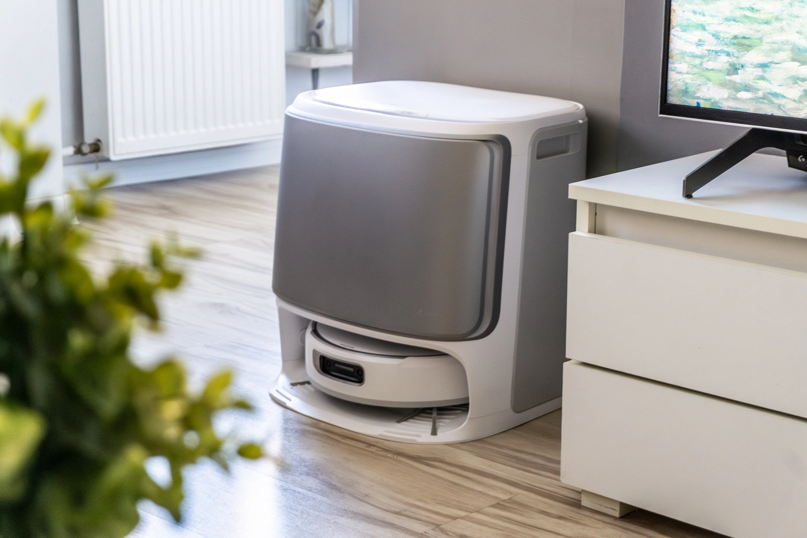 Obawiałem się, że wysoki robot nie wjedzie mi pod łóżko, bieżnię czy kaloryfer. W praktyce Narwal Flow zdobył wszystkie te trzy miejsca. Chociaż przyznaję – pod kaloryferem robi się czasem nerwowo. Robot niemal czuje go na swoim grzbiecie, ale mimo tego delikatnie, centymetr po centymetrze, zdobywa kolejny teren. Niestety, w efekcie powstały na nim rysy, widoczne pod światło. Sorry Narwal, przepraszam kolejny testerze!