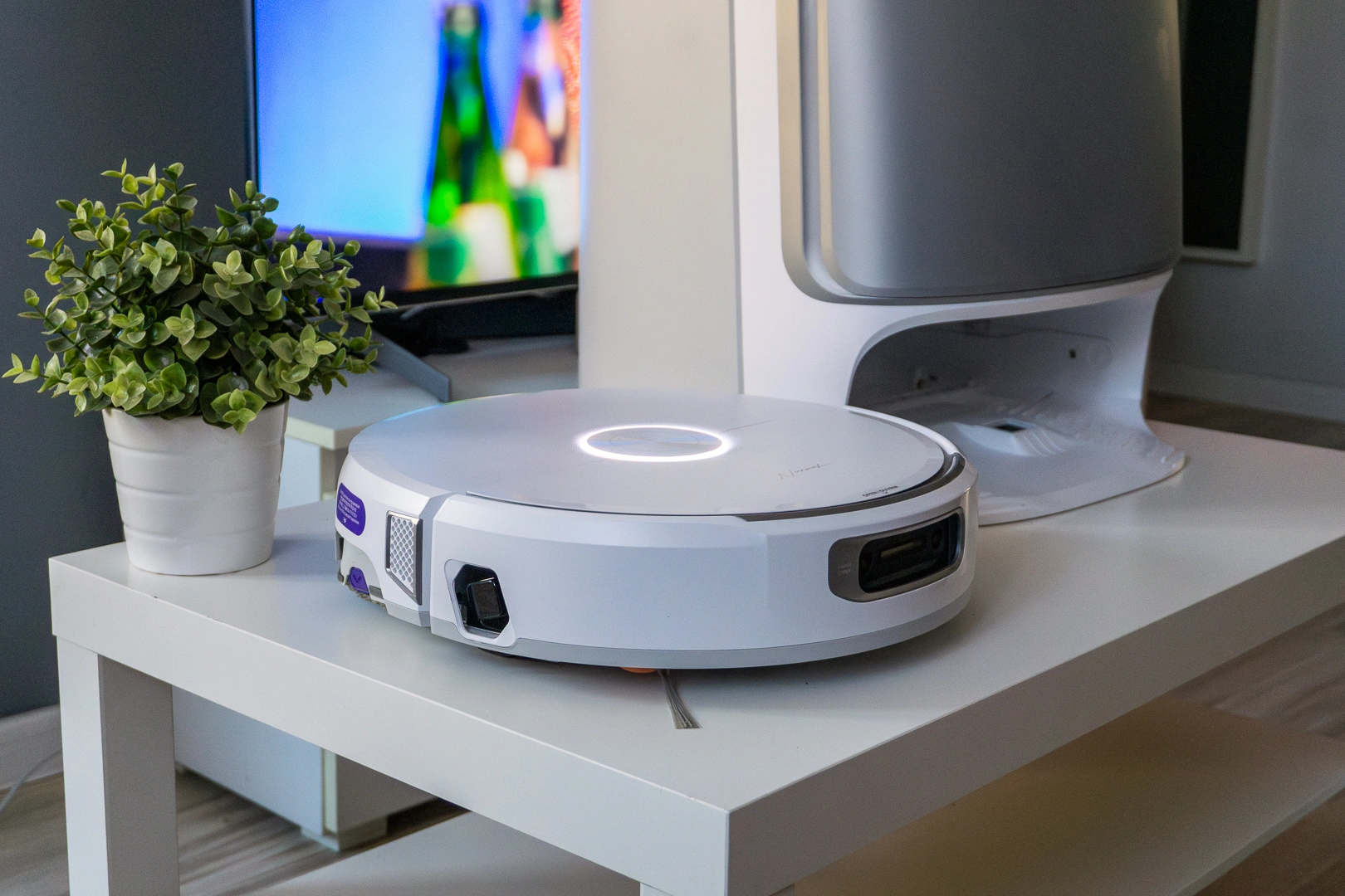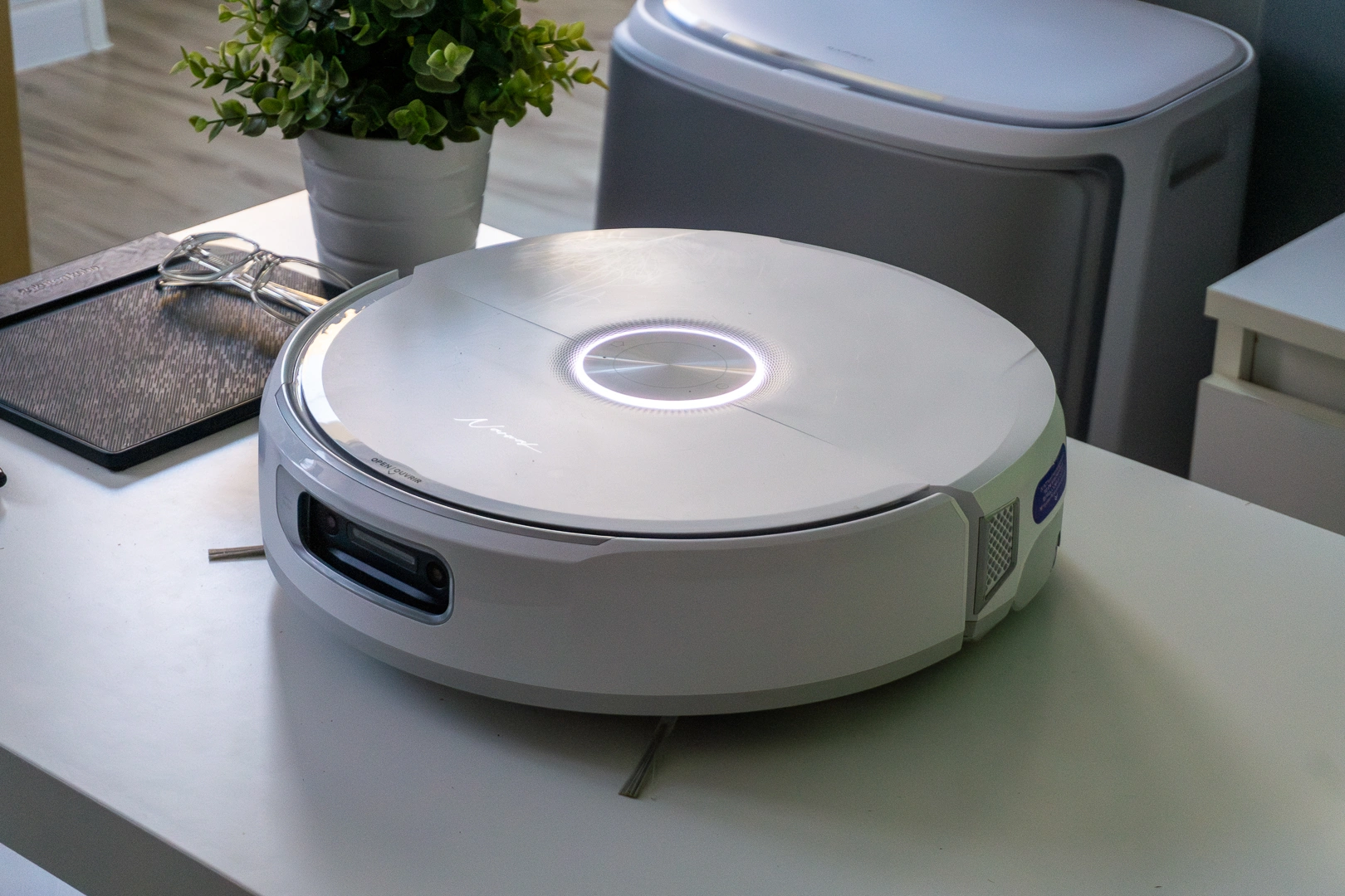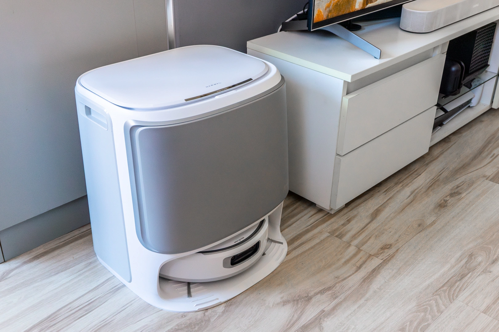 Wróćmy do LIDAR-a. Ten znajduje się na kuprze robota. Z kolei na froncie mamy dwie kamery RGB, umożliwiające rozpoznawanie obiektów. Robot ma dzięki temu widzieć kable, psie odchody czy szklanki z wodą, świadomie unikając kolizji. W praktyce Narwal Flow okazuje się robotem ostrożnym, który niemal nie wykorzystuje przedniego zderzaka do niuchania. To jeden z bardziej dżentelmeńskich i zachowawczych robotów, z jakimi miałem do czynienia. Jednocześnie bardzo precyzyjnych. Wymierzyłem odległość, z jaką sprzątał wokół pełnego, chwiejnego worka na śmieci – 0,7 cm. Nieźle. Samego worka nie dotknął ani razu.