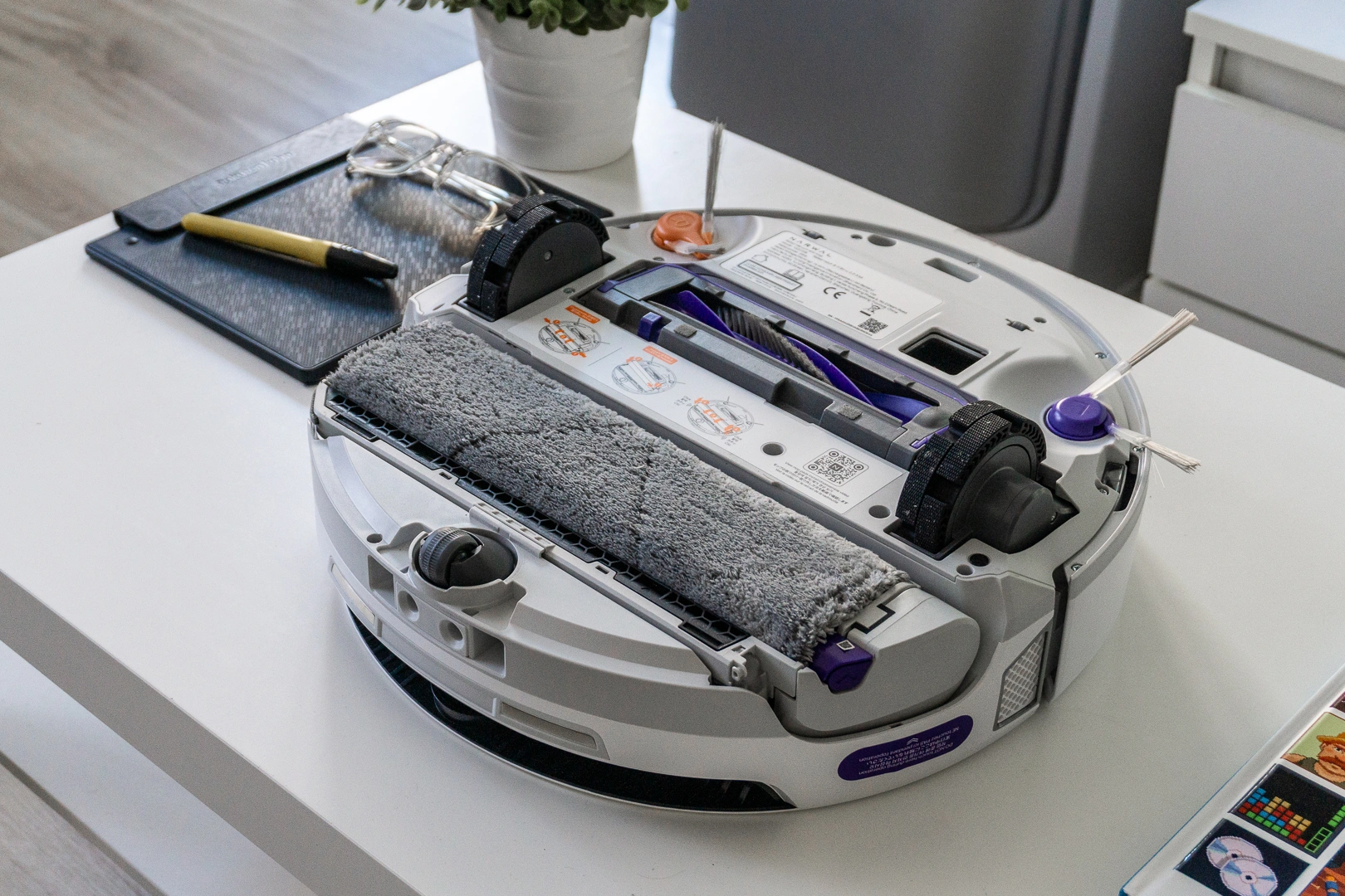 Na pierwszy rzut oka, po obróceniu robota na grzbiet, rolka taśmowa wygląda jak klasyczna tacka mopująca. Dopiero po jej wyjęciu widzimy, że to kompletnie inny mechanizm. Mamy do czynienia z bardzo krótką linią taśmową, działającą na podobnej zasadzie, co taśmociągi w wielkich fabrykach. Na taśmę nałożono wyjmowaną, materiałową nakładkę mopującą.