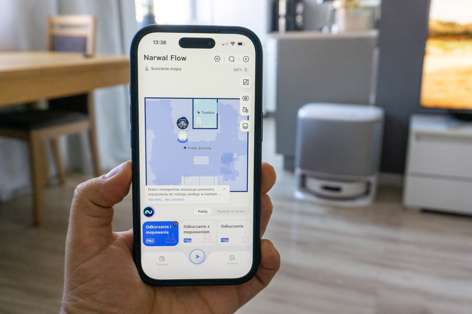 - Tryb: odkurzanie i mopowanie, mopowanie po odkurzaniu, odkurzanie, mopowanie