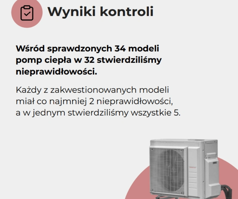 Boom na pompy ciepła trwa, ale niestety za popytem nie zawsze nadąża jakość. Z najnowszej kontroli przeprowadzonej przez Urząd Ochrony Konkurencji i Konsumentów, Inspekcję Handlową oraz Krajową Administrację Skarbową wynika, że na 34 sprawdzonych modeli pomp ciepła aż 32 nie spełniały wymogów Unii Europejskiej. To oznacza, że ponad 94 proc. skontrolowanych produktów nie powinno w ogóle trafić do obrotu.