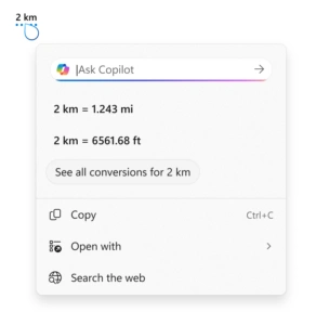 - Kliknij, aby wykonać (Click To Do) - funkcja dostępna na komputerach Copilot+ PC otrzymała nowe możliwości. Dodano selekcję obiektów na obrazach przez najechanie myszką, co ma przyspieszyć kreatywny workflow. Można kopiować wybrane elementy do innych aplikacji lub wykorzystywać je w rozmowach z Copilotem. Funkcja obejmuje też konwersję jednostek miar - po najechaniu na kombinację liczby i jednostki pojawia się podpowiedź z przeliczeniem, a po zaznaczeniu otwiera się menu kontekstowe z dodatkowymi opcjami.