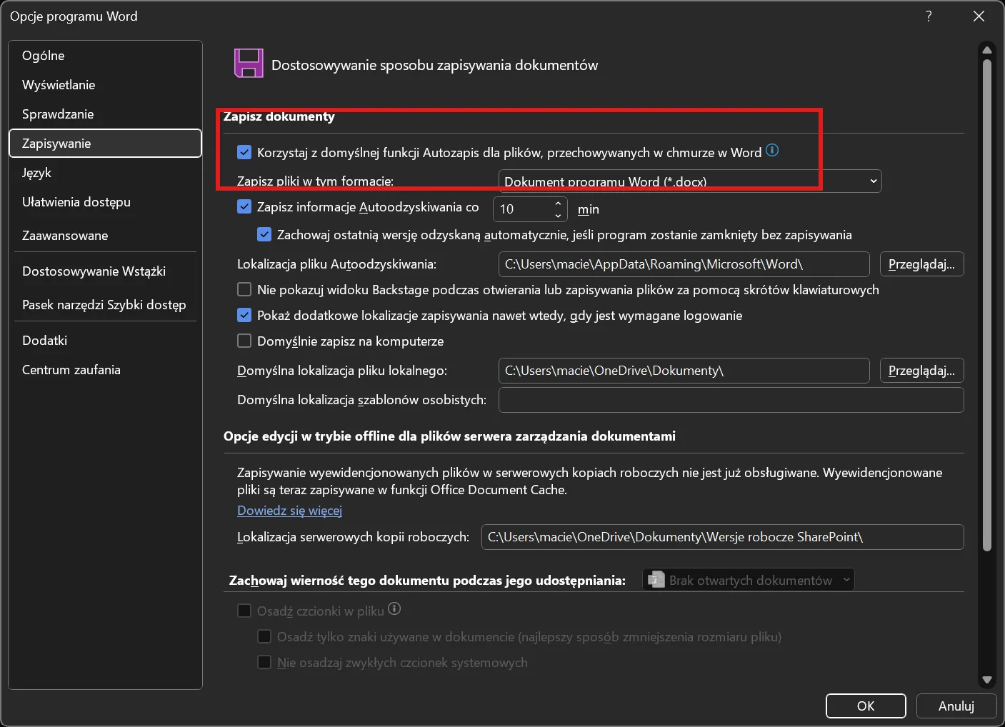 Aby włączyć domyślny autozapis, wystarczy być zalogowanym na swoje Konto Microsoft w Wordzie i upewnić się, że na OneDrive jest wolne miejsce. Mechanizm można włączać i wyłączać w menu Plik > Opcje > Zapisywanie. Upewnij się, że zaznaczona jest funkcja Korzystaj z domyślnej funkcji Autozapis dla plików przechowywanych w chmurze w Word.
