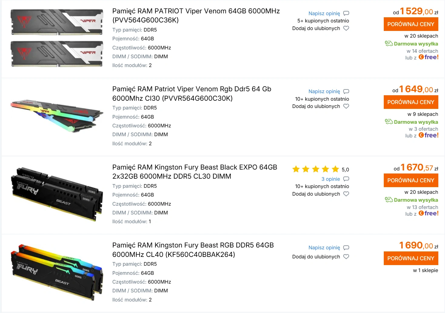 Takie informacje zapewnia nam obecnie Ceneo, gdzie najtańsze dostępne kości RAM DDR5 64 GB o rekomendowanej specyfikacji 6000 MHz, CL30 zaczynają się od 1530 złotych.