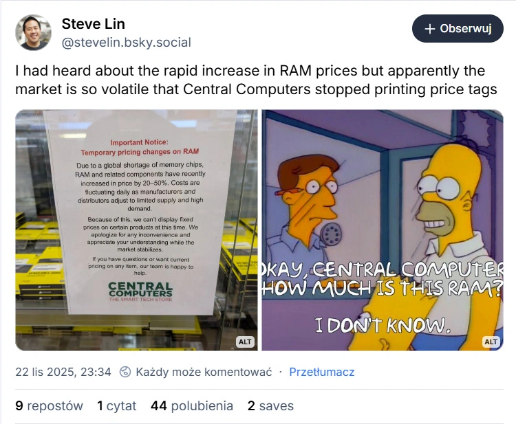 Choć ja mogę mówić o szczęściu, to o nim nie mogą mówić osoby, które teraz próbują złożyć komputer i w budżecie od 4 do 5 tys., 900 złotych zjada im sam RAM. Wciąż pozostaję w kręgach składaczy komputerów i osób szukających pomocy, i widzę, że ludzie wciąż nie rozumieją, że sytuacja nie jest tymczasowa, że taniego RAMu już po prostu nie ma.