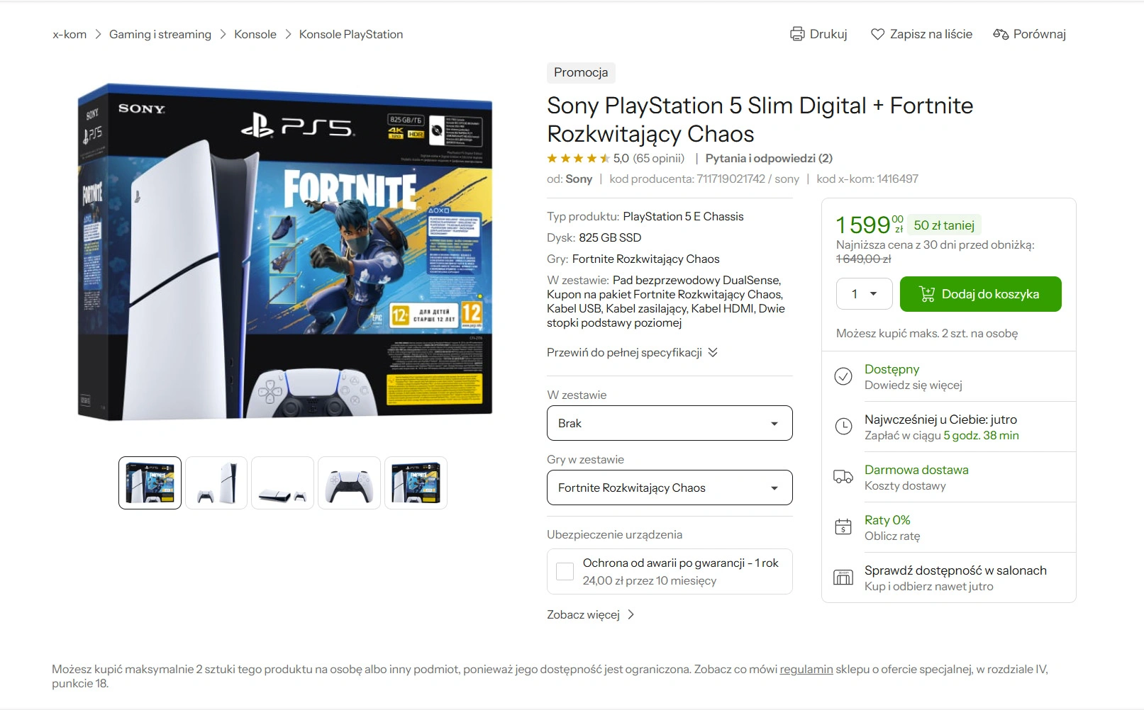 A w razie, gdyby ta promocja się skończyła, kolejna najniższa oferta to jedynie 1703 zł za PlayStation 5 Digital Edition (bez Fortnite).